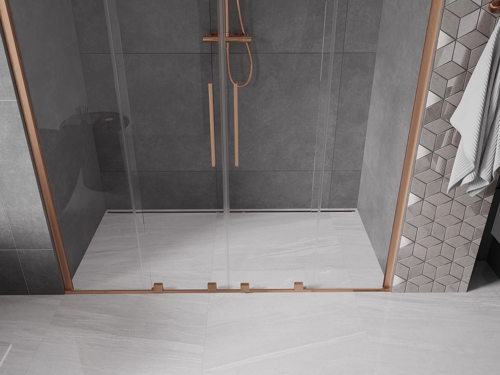 Практичната и удобна дръжка е изработена от неръждаема стомана. Модерната форма в комбинация с покритие, съчетано с цвета на профилите, придава на цялото съвременен и стилен вид, подчертавайки естетиката на всяка баня.