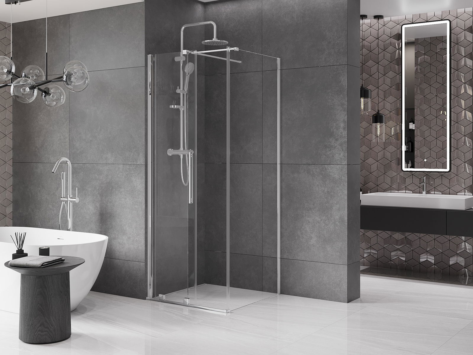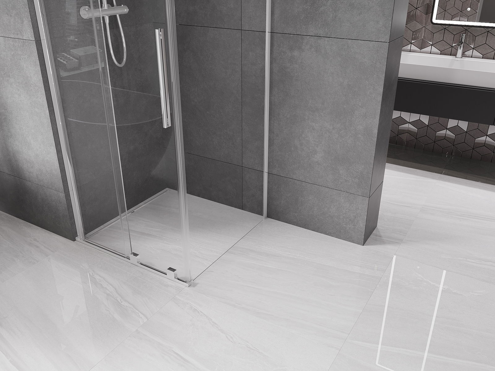 Практичната и удобна дръжка е изработена от неръждаема стомана. Модерната форма в комбинация с покритие, съчетано с цвета на профилите, придава на цялото съвременен и стилен вид, подчертавайки естетиката на всяка баня.