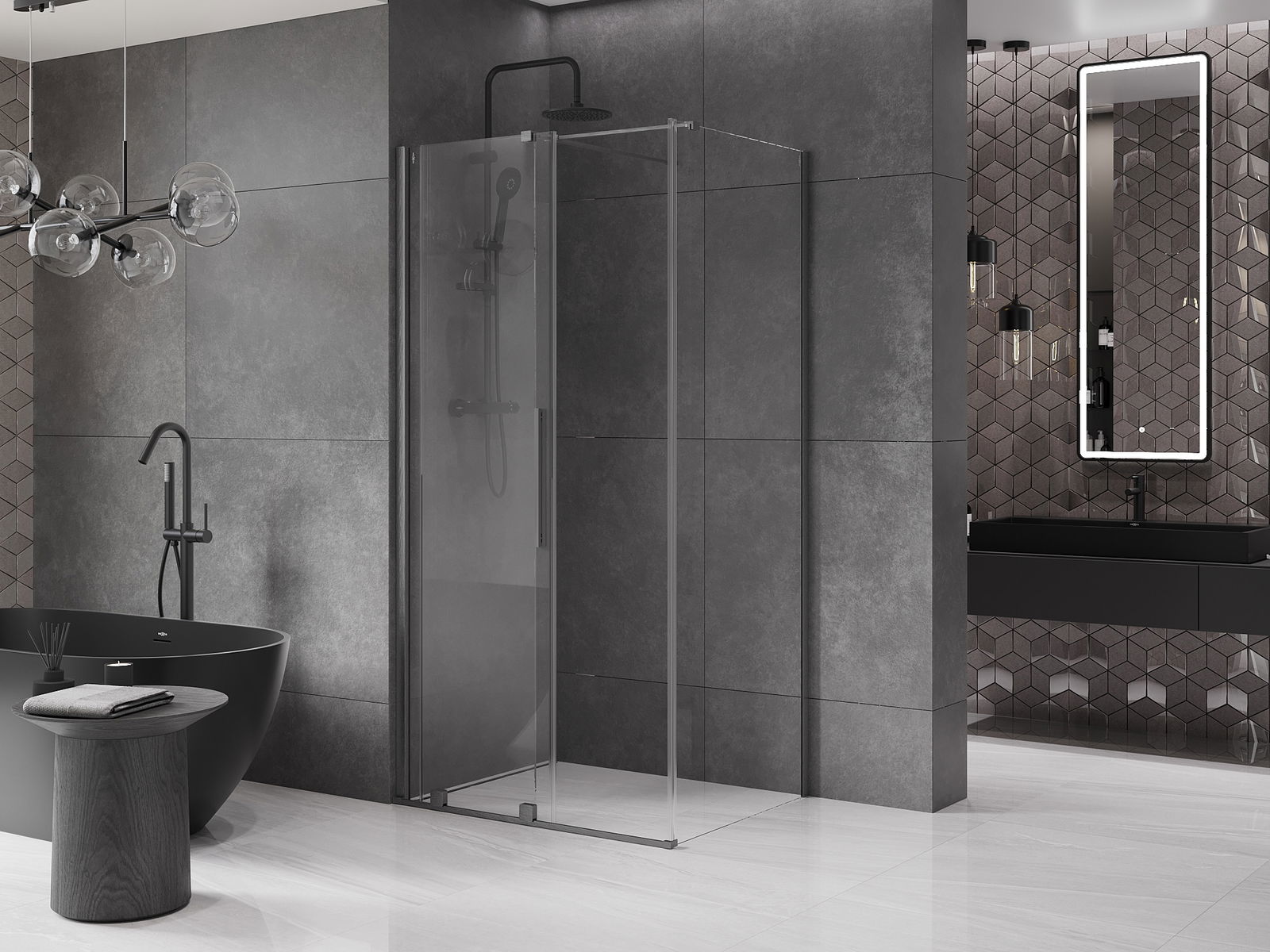 Практичната и удобна дръжка е изработена от неръждаема стомана. Модерната форма в комбинация с покритие, съчетано с цвета на профилите, придава на цялото съвременен и стилен вид, подчертавайки естетиката на всяка баня.