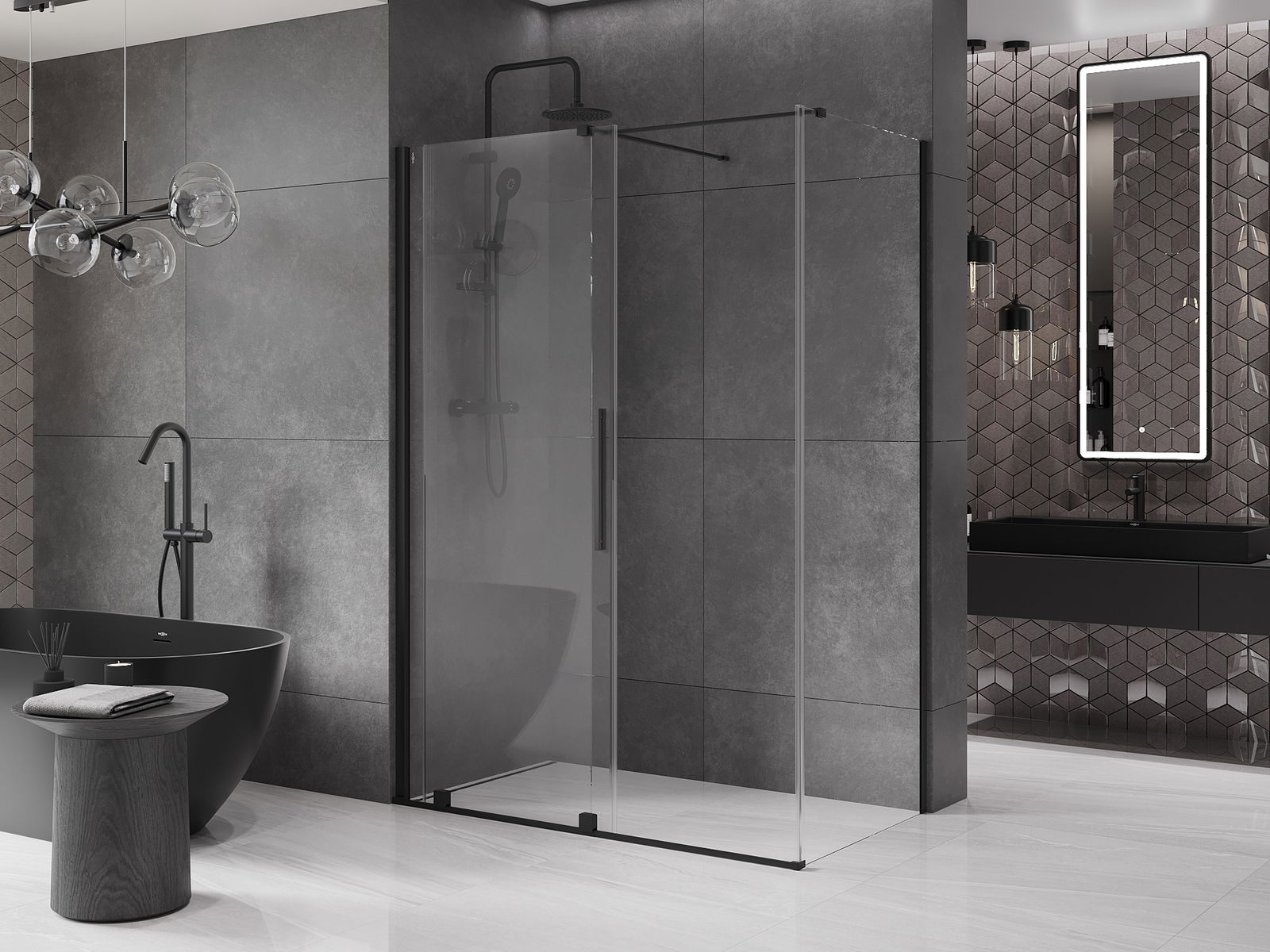 Практичната и удобна дръжка е изработена от неръждаема стомана. Модерната форма в комбинация с покритие, съчетано с цвета на профилите, придава на цялото съвременен и стилен вид, подчертавайки естетиката на всяка баня.