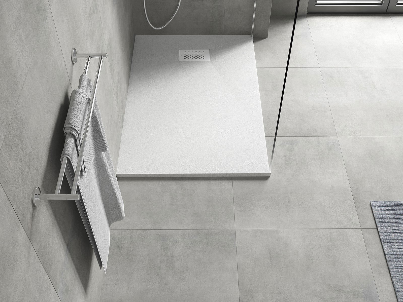 Повърхността на таблата за душ наподобява камък със структурата му. Това е уникална комбинация от естествен външен вид с модерна интериорна подредба. Той добавя характер, подчертава естетиката и елегантността на декора на банята и впечатлява с формата си.