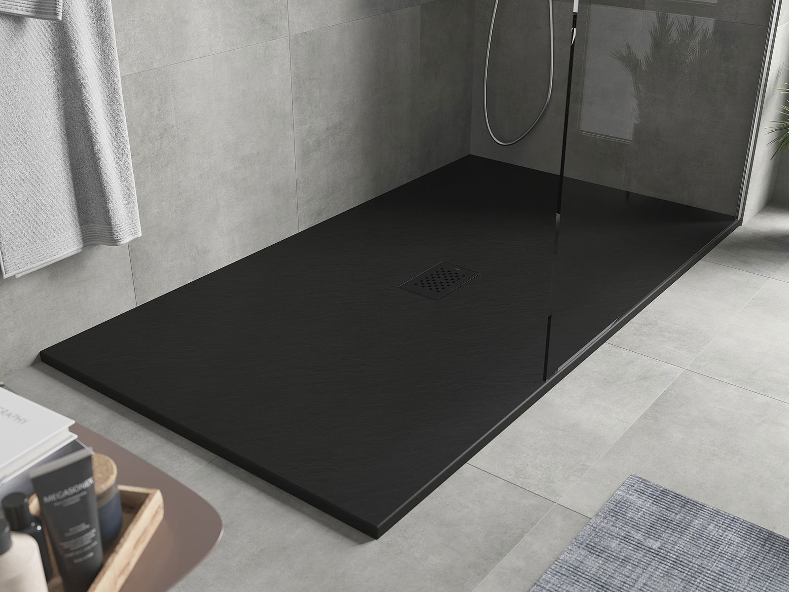 Повърхността на таблата за душ наподобява камък със структурата му. Това е уникална комбинация от естествен външен вид с модерна интериорна подредба. Той добавя характер, подчертава естетиката и елегантността на декора на банята и впечатлява с формата си.
