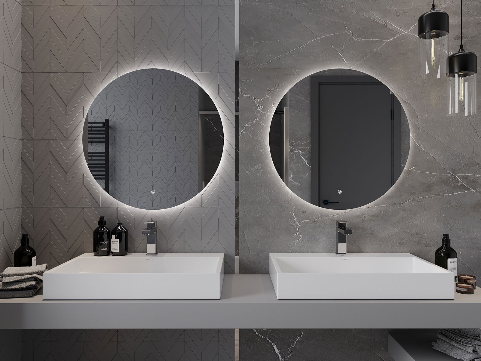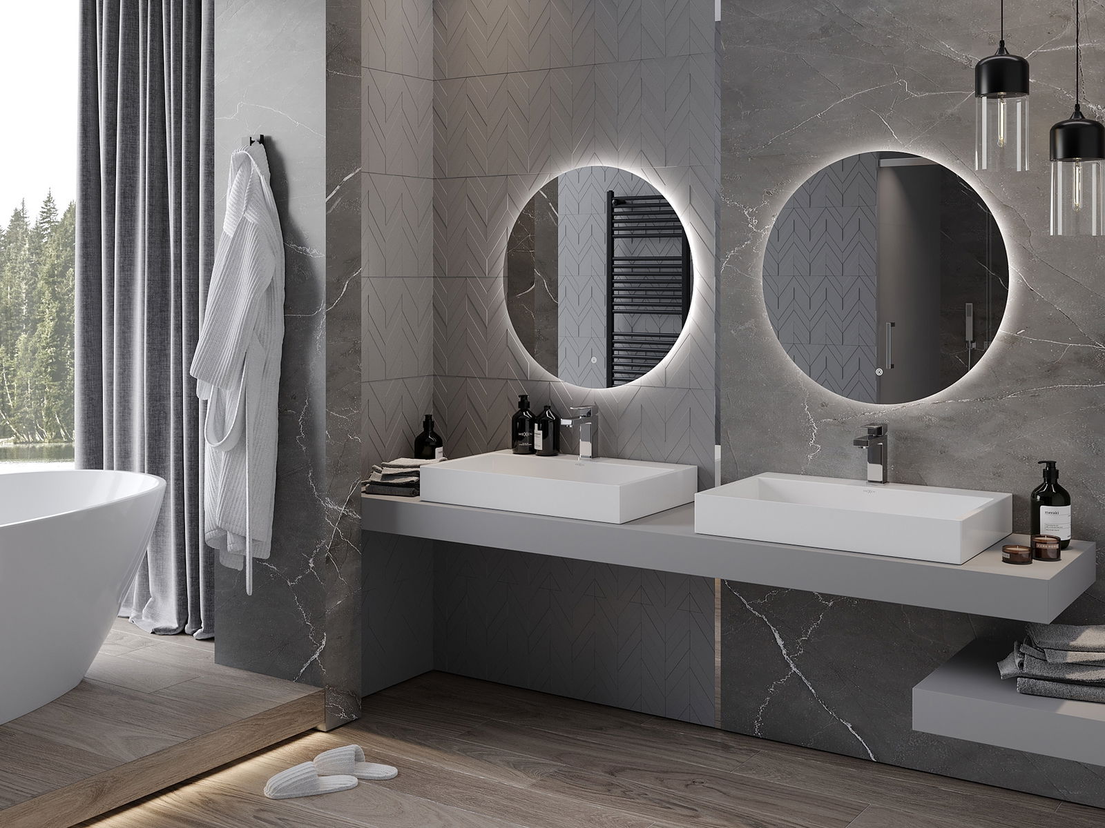 LED подсветката на огледалото е практичен елемент, който улеснява ежедневната грижа, благодарение на възможността за идеално осветление на лицето. Подсветката придава на банята модерен завършек, подчертавайки елегантния му декор.