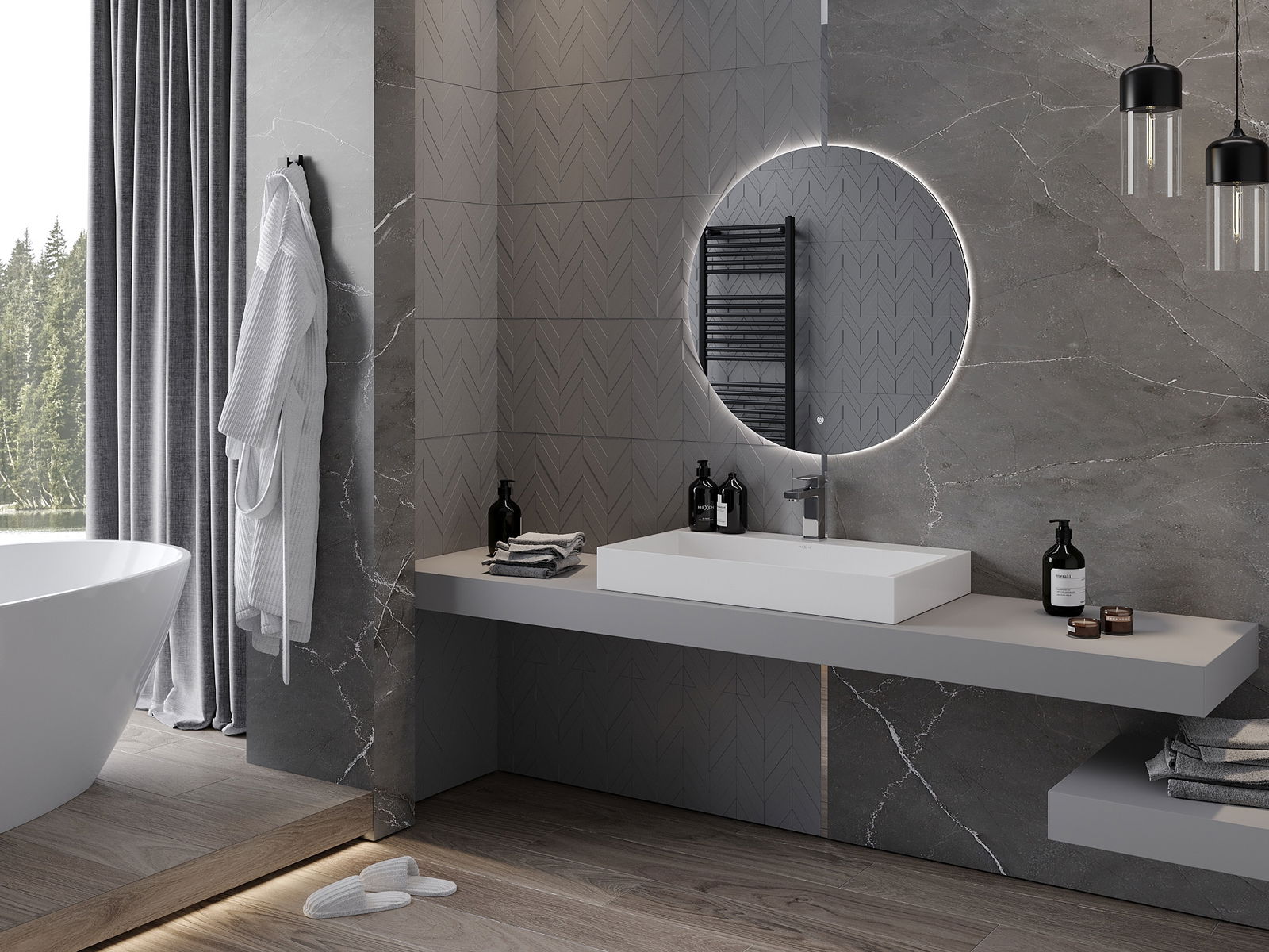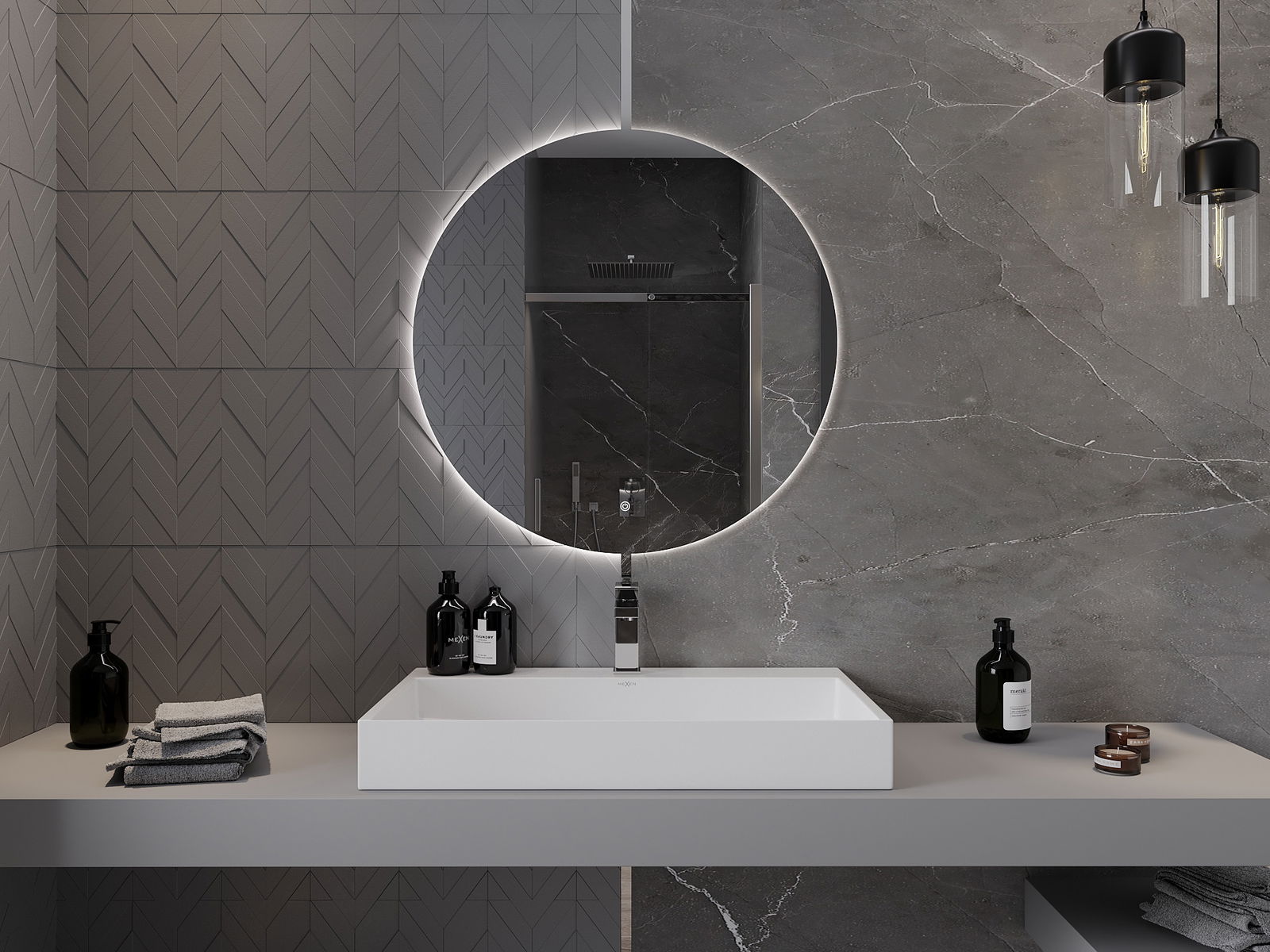 LED подсветката на огледалото е практичен елемент, който улеснява ежедневната грижа, благодарение на възможността за идеално осветление на лицето. Подсветката придава на банята модерен завършек, подчертавайки елегантния му декор.