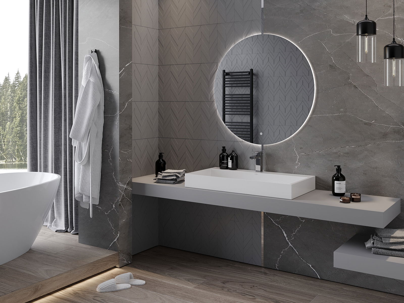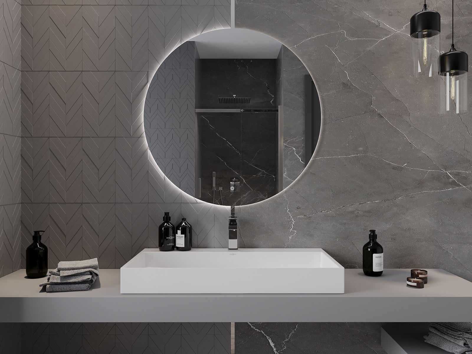 LED подсветката на огледалото е практичен елемент, който улеснява ежедневната грижа, благодарение на възможността за идеално осветление на лицето. Подсветката придава на банята модерен завършек, подчертавайки елегантния му декор.
