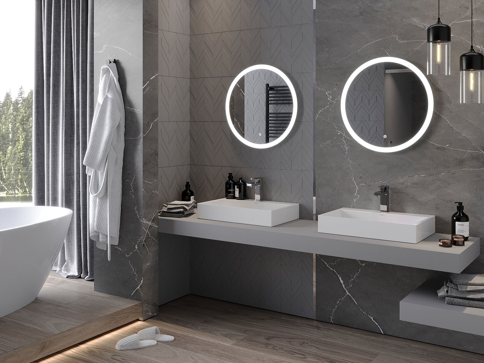 LED подсветката на огледалото е практичен елемент, който улеснява ежедневната грижа, благодарение на възможността за идеално осветление на лицето. Подсветката придава на банята модерен завършек, подчертавайки елегантния му декор.