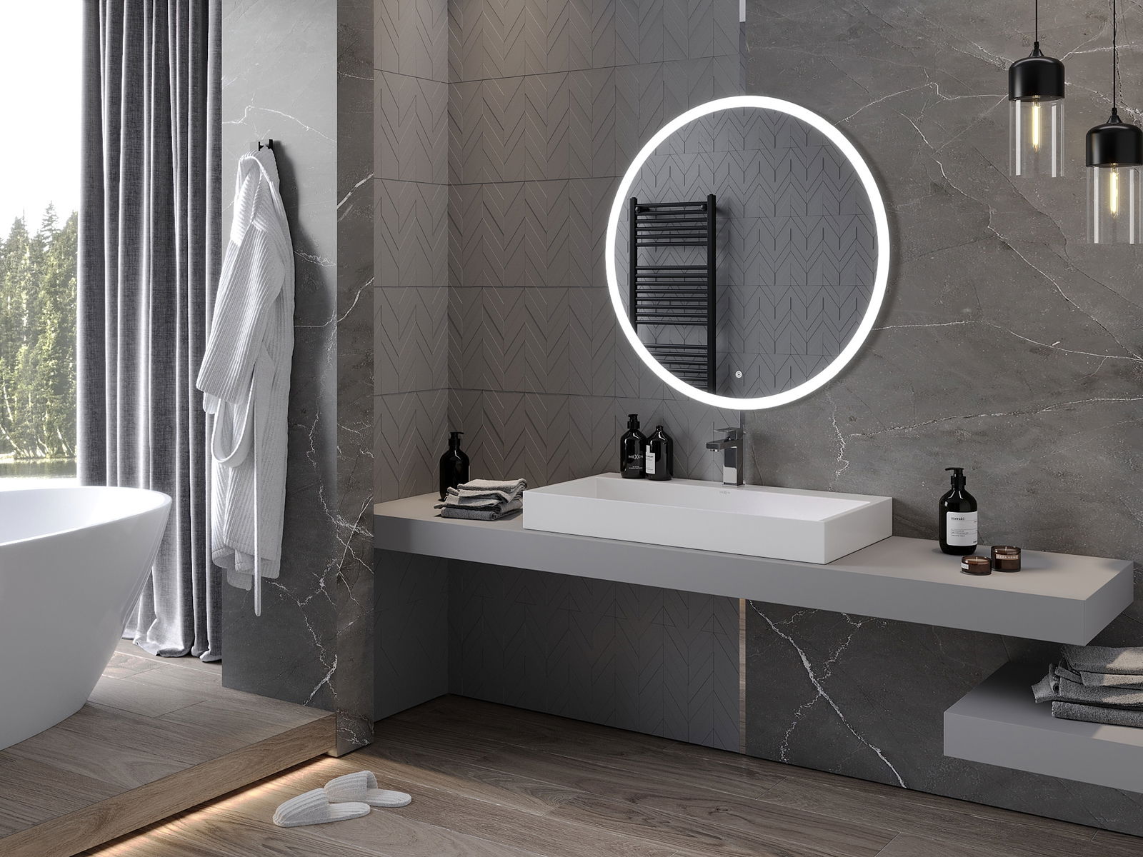 LED осветлението около огледалото е практичен елемент, който улеснява ежедневната грижа със способността за идеално осветяване на лицето. Осветлението придава на банята модерно излъчване, подчертавайки нейния елегантен интериор.