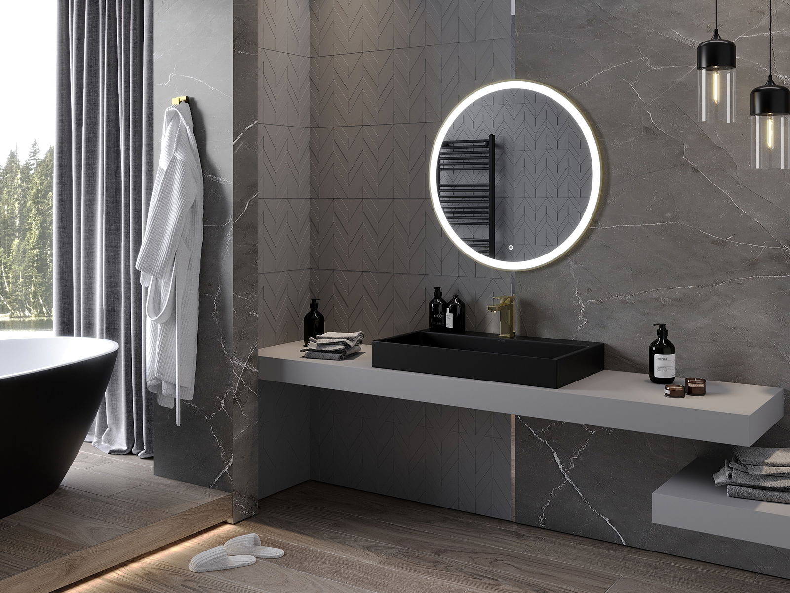 LED подсветката на огледалото е практичен елемент, който улеснява ежедневната грижа, благодарение на възможността за идеално осветление на лицето. Подсветката придава на банята модерен завършек, подчертавайки елегантния му декор.