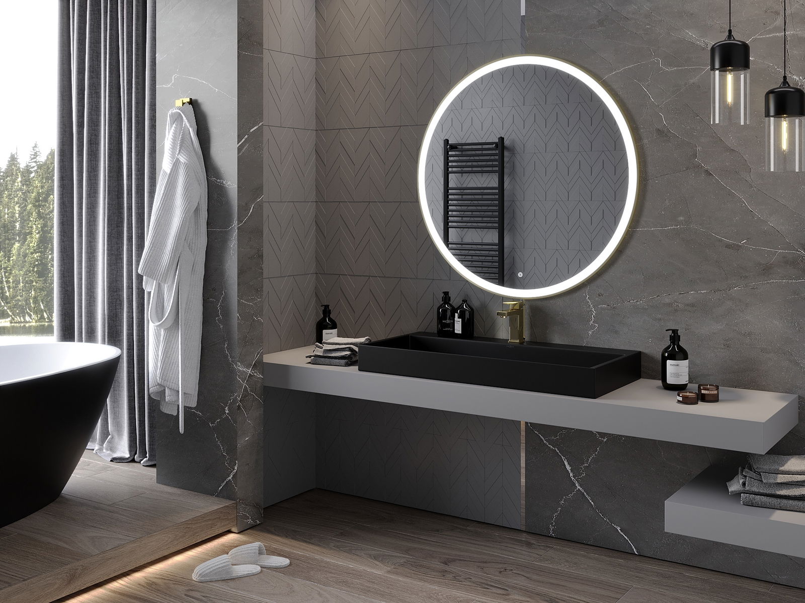 LED осветлението около огледалото е практичен елемент, който улеснява ежедневната грижа със способността за идеално осветяване на лицето. Осветлението придава на банята модерно излъчване, подчертавайки нейния елегантен интериор.