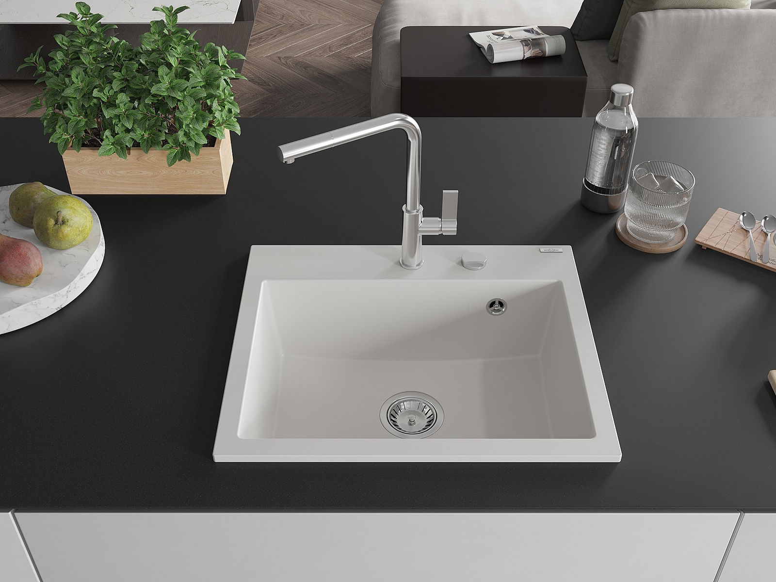 Мивката е направена от висококачествен гранит. Това е елегантно и най -вече практично допълнение към всяка кухня, независимо от нейния стил. Висококачествената и гранитна издръжливост осигуряват много години употреба.