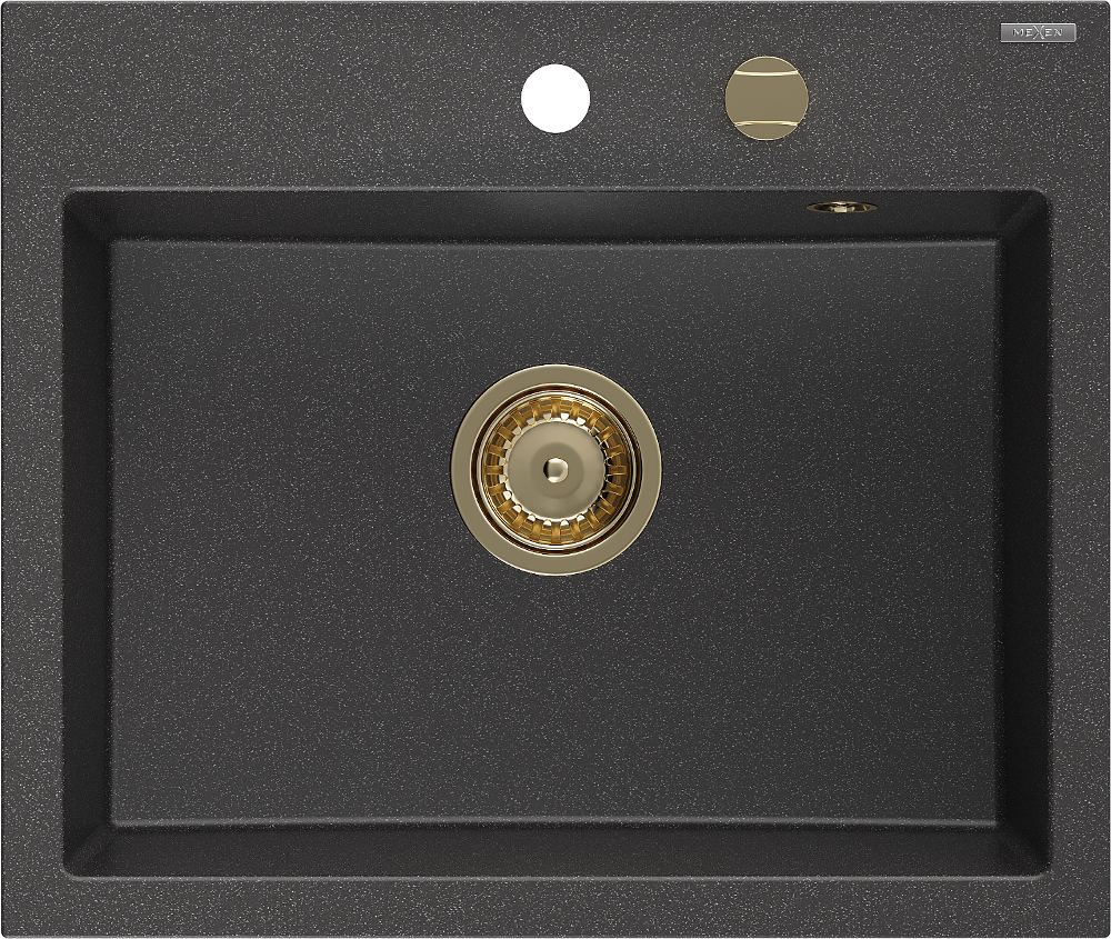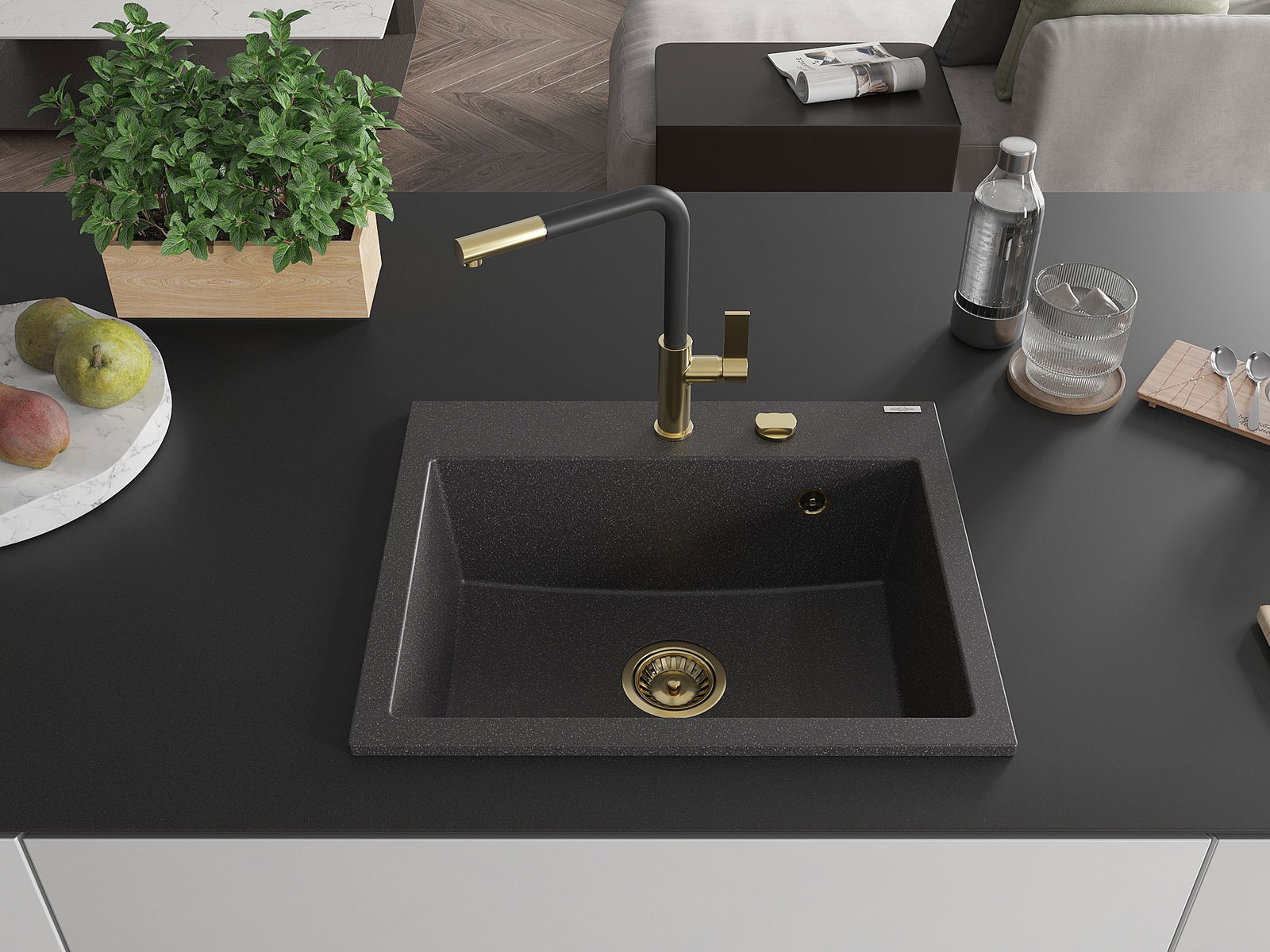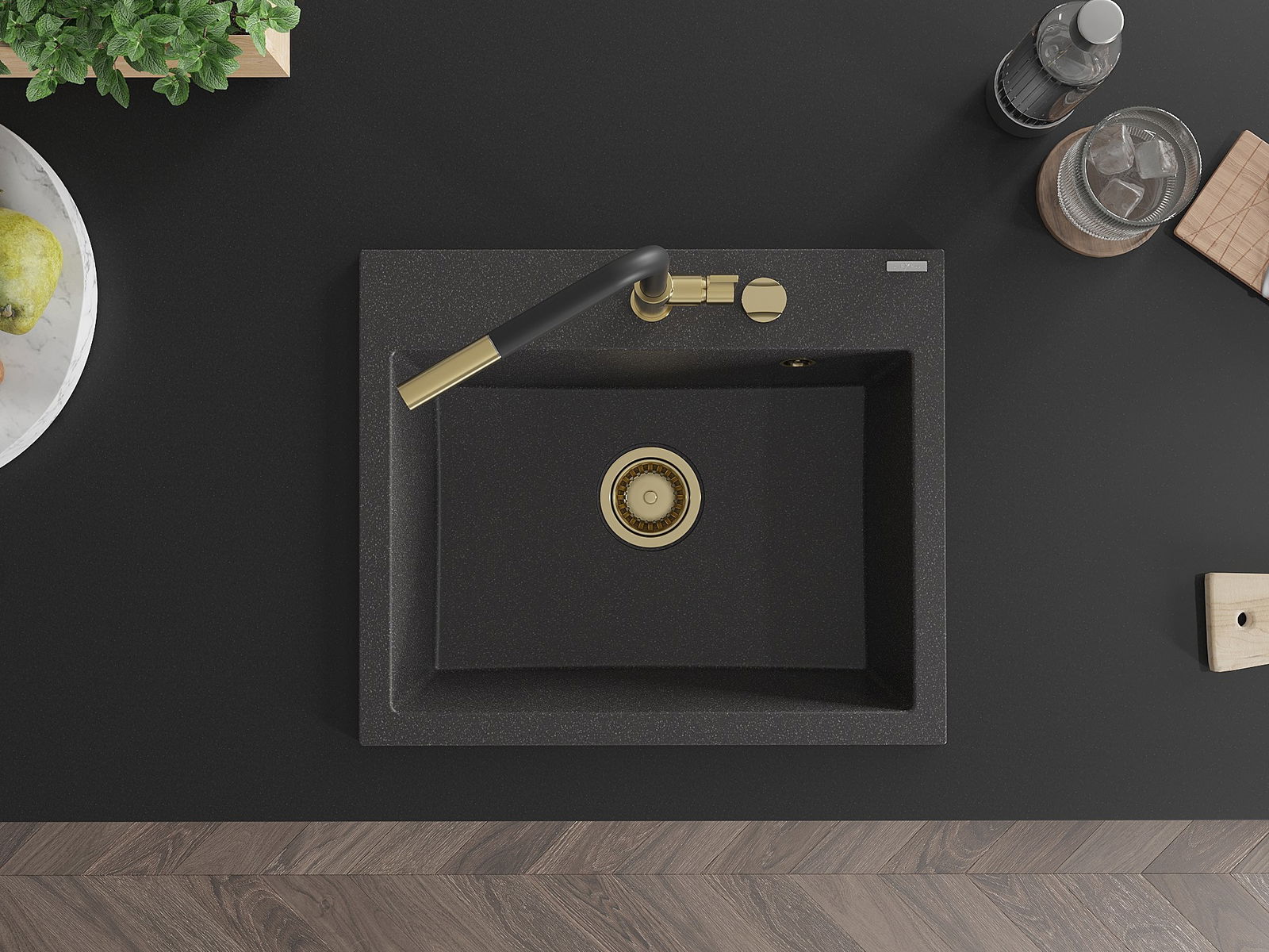 Mexen Oscar гранитна мивка с 1 отделение 580 x 490 мм, черна на петна, златен сифон - 6519581000-76-G