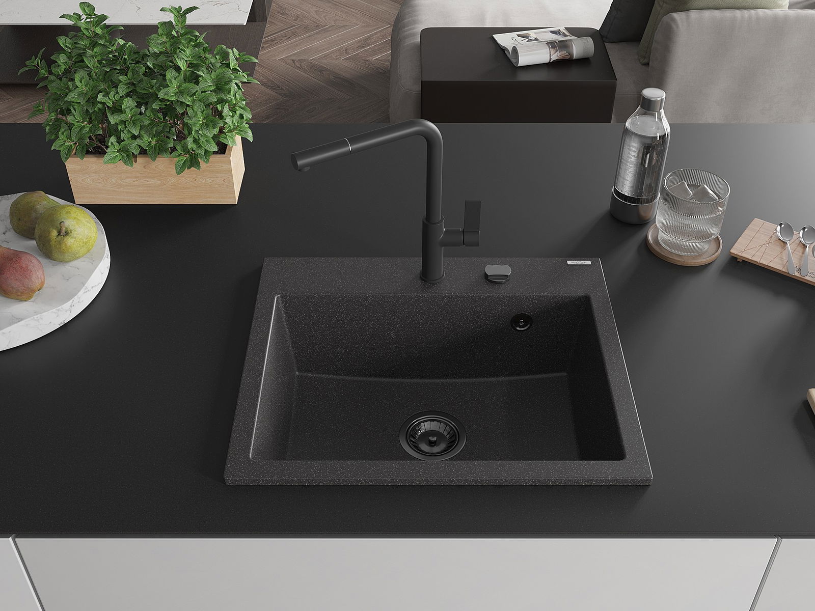 Mexen Oscar мивка от гранит, 1-камерна, 580 x 490 мм, черна с напръски, сифон черен - 6519581000-76-B