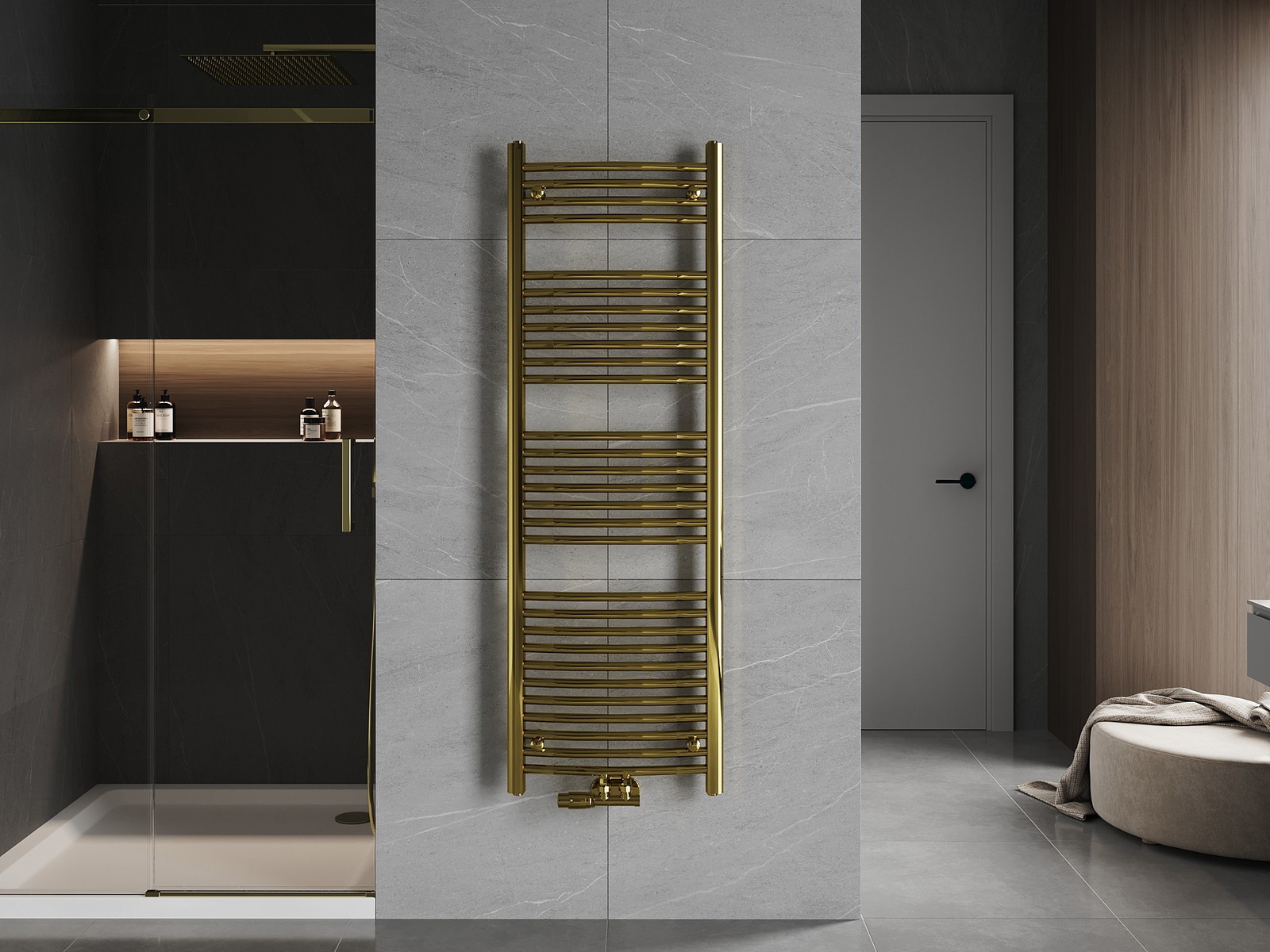 Mexen Ares банен радиатор е елегантно допълнение към всяка баня. Изработен от стомана, характеризира се с впечатляващи размери 1500 x 500 мм и отоплителна мощност 498 W. Златният цвят придава на интериора луксозен характер. Радиаторът е оборудван със долни и средни свързвания и възможност за монтаж на нагревател. Благодарение на висококачественото покритие е устойчив на корозия. Комплектът съдържа закачалки, монтажен комплект, запушващи тапи и въздухоотвод, което улеснява инсталацията.
