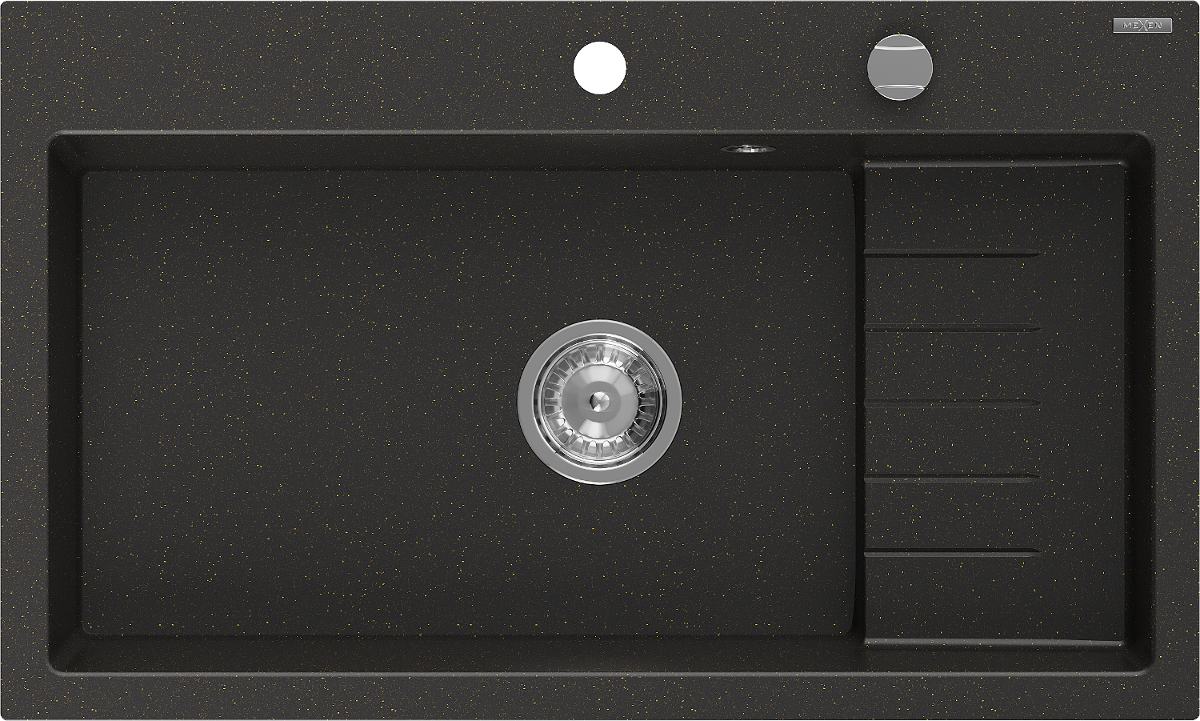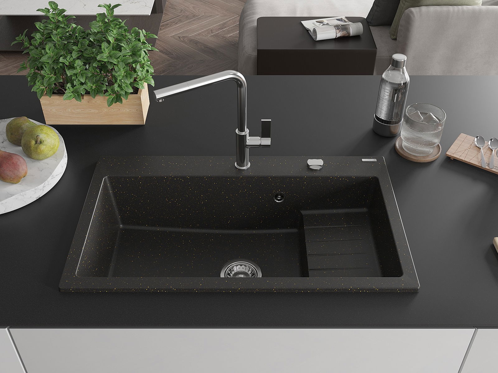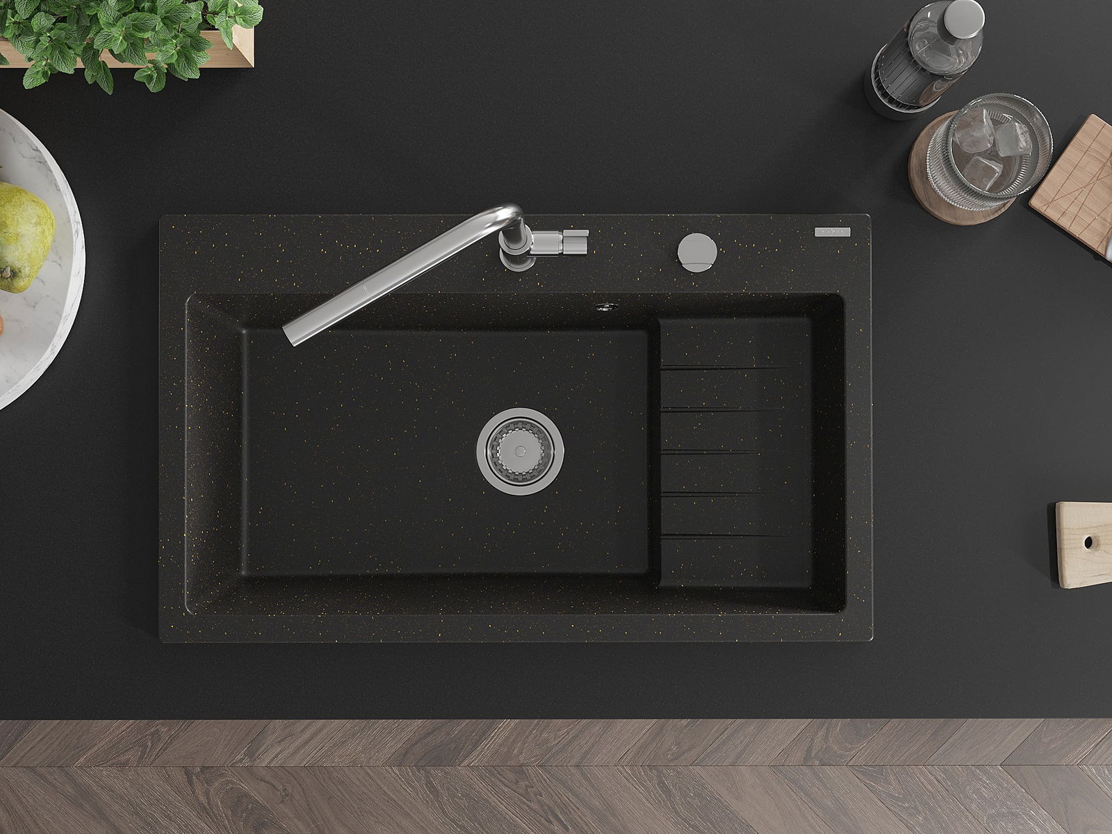 Mexen Omar гранитна мивка с 1 гнездо 800 x 480 мм, черен/златист металик, сифон хром - 6520801005-75