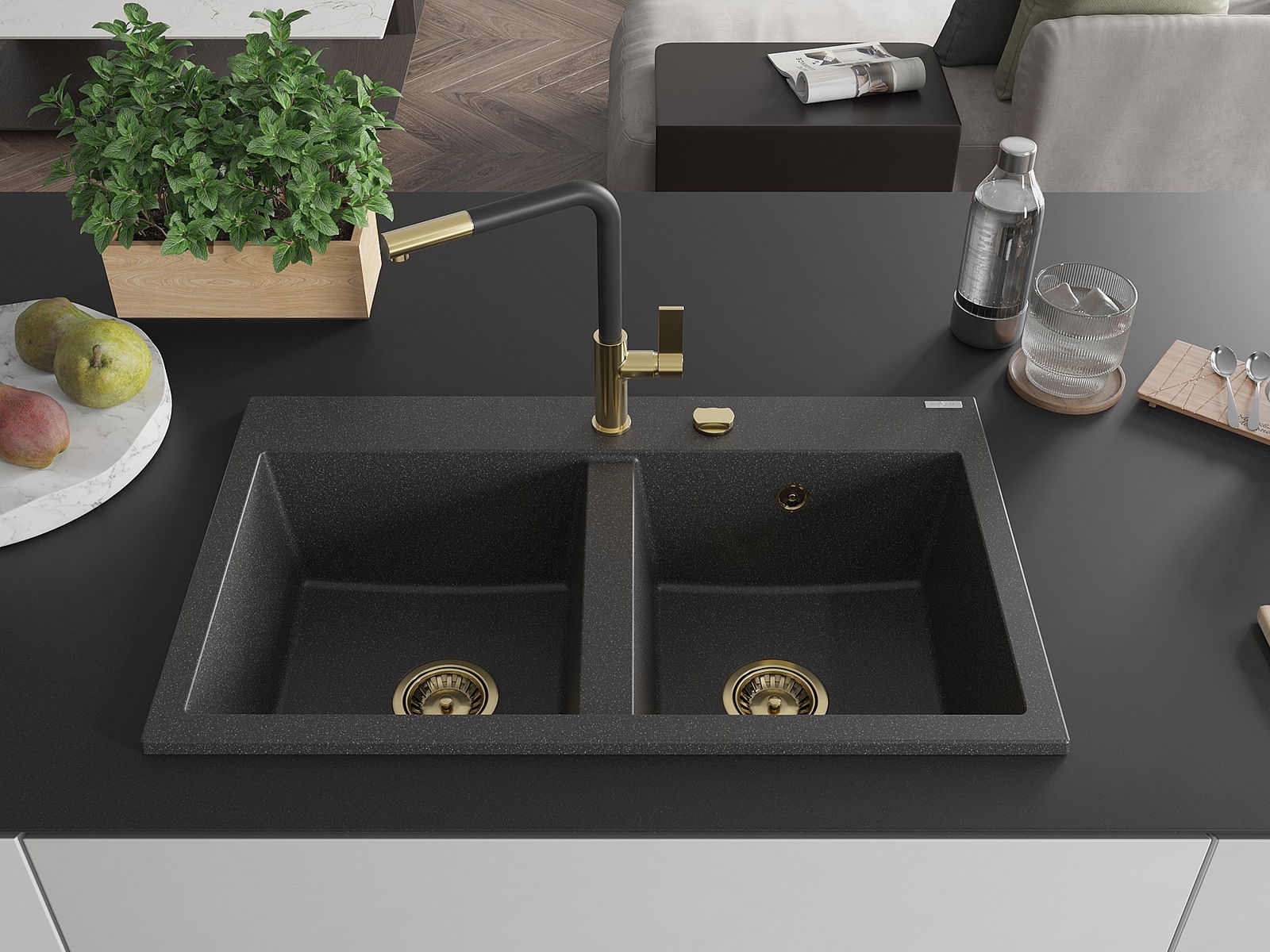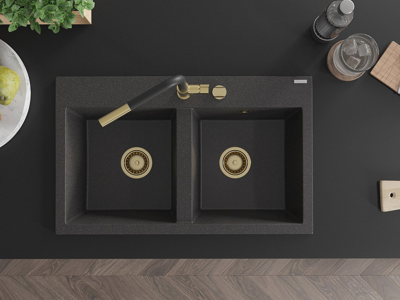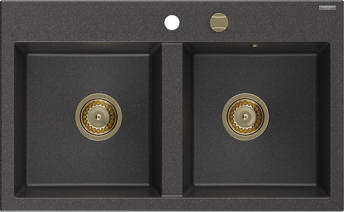 Mexen Hektor гранитна мивка с 2 камери 800 x 480 мм, черна с пръски, сифон златист - 6521802000-76-G