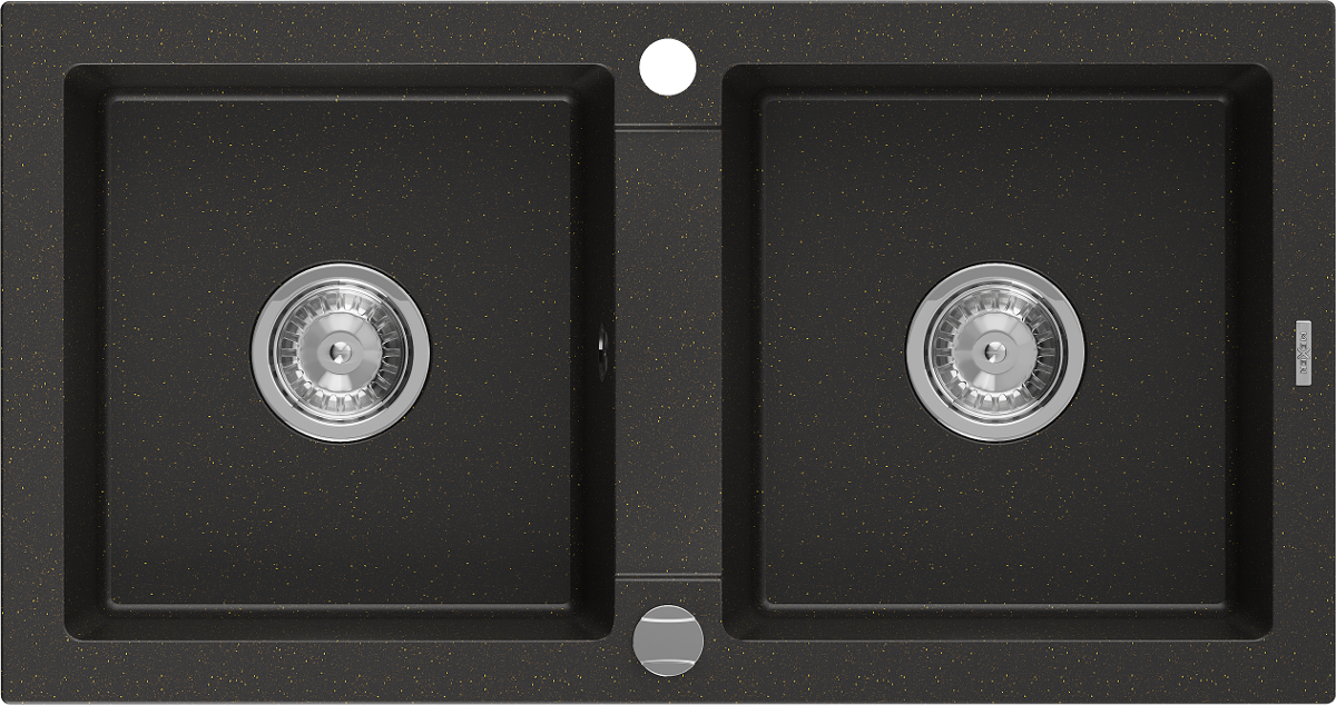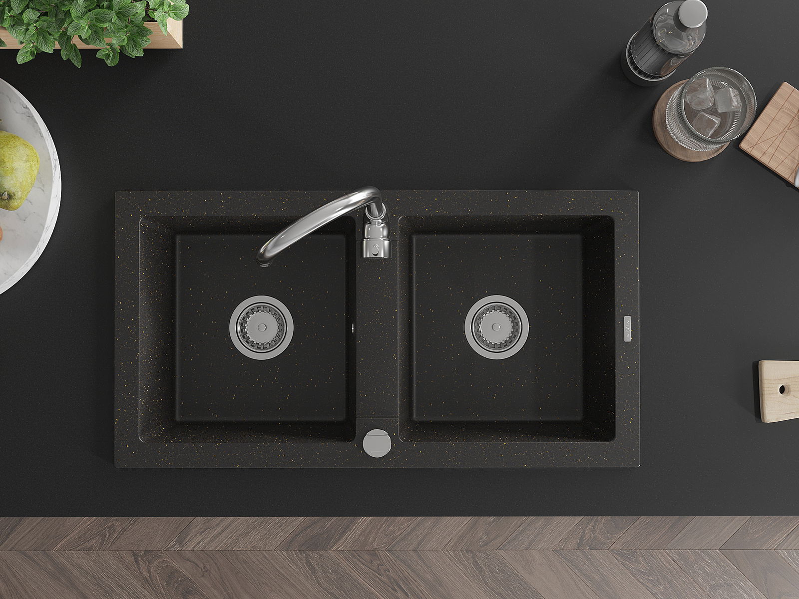 Mexen Mario гранитна мивка с 2 отделения 820 x 436 mm, черен/златен металик, хромиран сифон - 6504822000-75