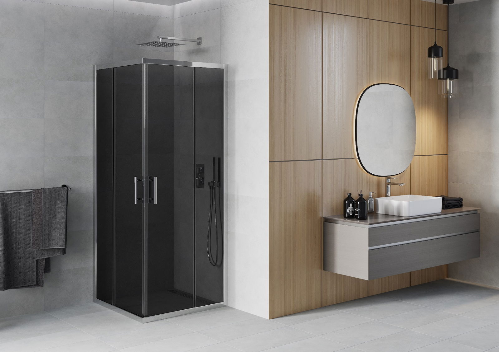Удобната и практична дръжка е изработена от здрав и устойчив метал. Модерната форма в съчетание с покритието, съответстващо на цвета на профилите, придава на цялото модерен и стилен вид, подчертавайки естетиката на всяка баня.