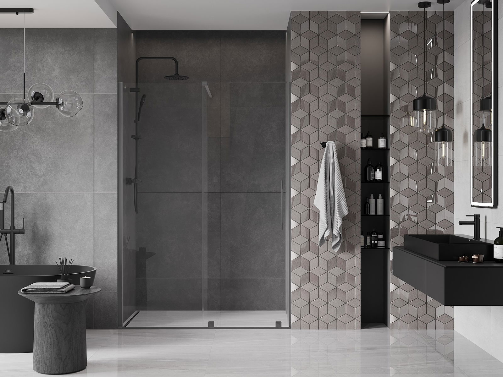 Практичната и удобна дръжка е изработена от неръждаема стомана. Модерната форма в комбинация с покритие, съчетано с цвета на профилите, придава на цялото съвременен и стилен вид, подчертавайки естетиката на всяка баня.