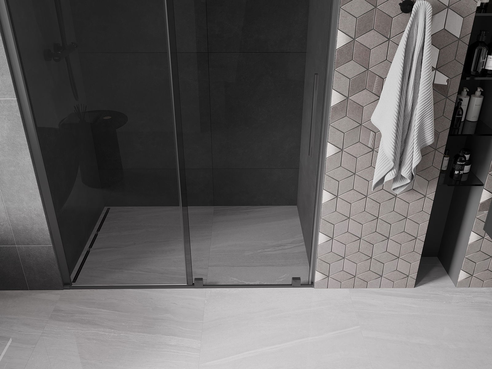 Практичната и удобна дръжка е изработена от неръждаема стомана. Модерната форма в комбинация с покритие, съчетано с цвета на профилите, придава на цялото съвременен и стилен вид, подчертавайки естетиката на всяка баня.