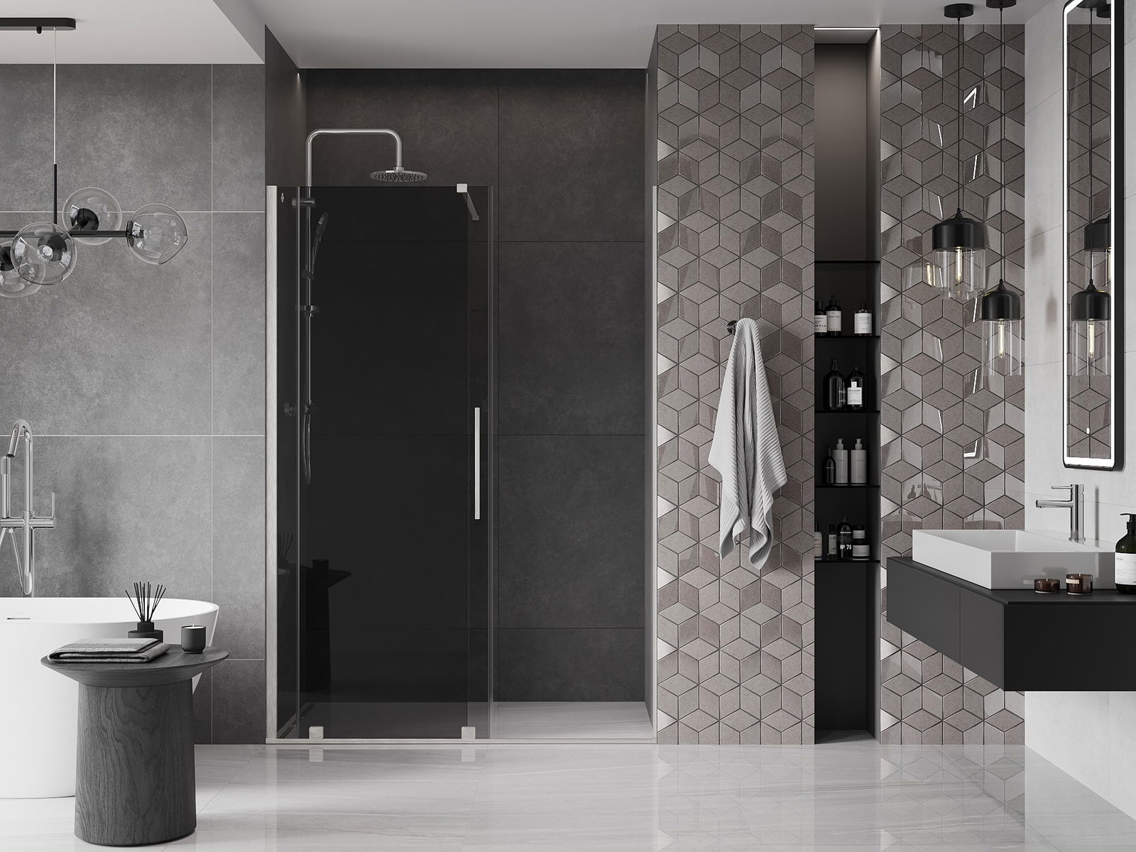Практичната и удобна дръжка е изработена от неръждаема стомана. Модерната форма в комбинация с покритие, съчетано с цвета на профилите, придава на цялото съвременен и стилен вид, подчертавайки естетиката на всяка баня.