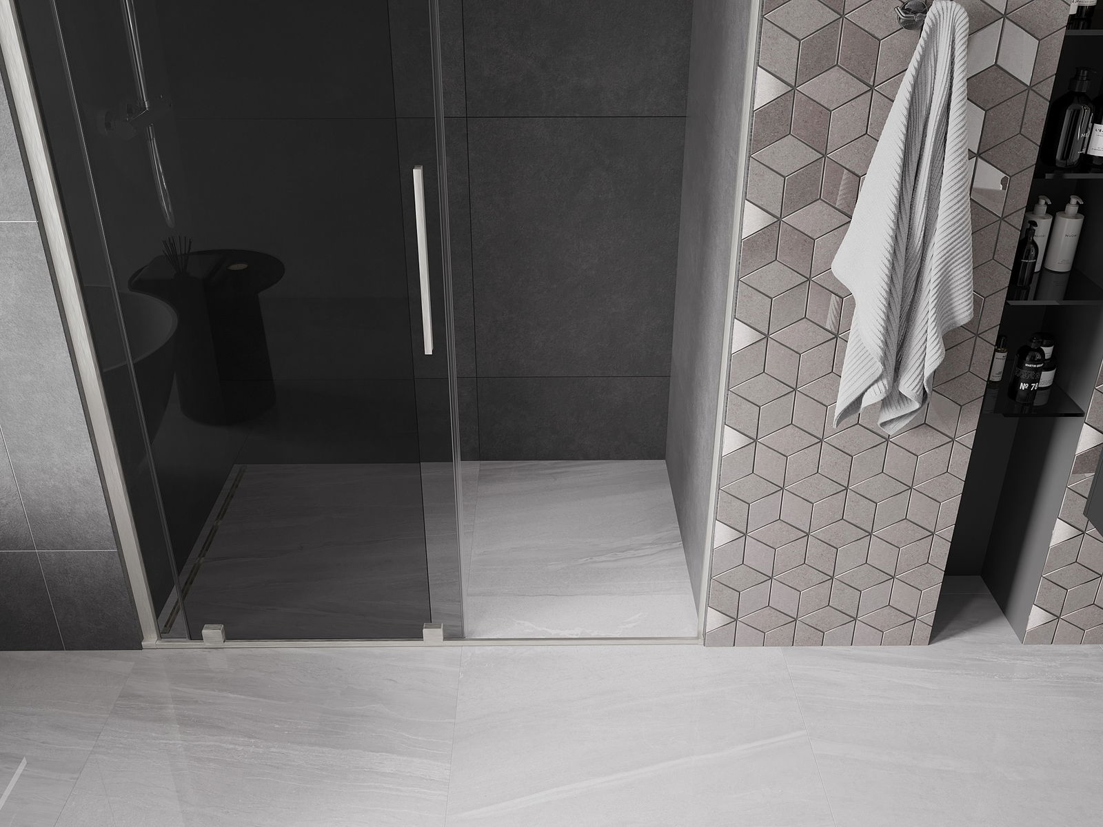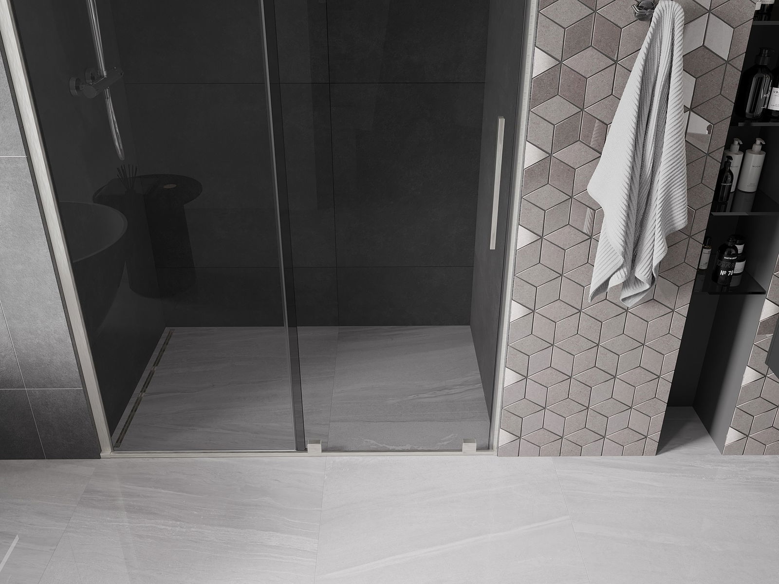 Практичната и удобна дръжка е изработена от неръждаема стомана. Модерната форма в комбинация с покритие, съчетано с цвета на профилите, придава на цялото съвременен и стилен вид, подчертавайки естетиката на всяка баня.