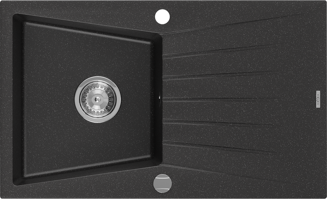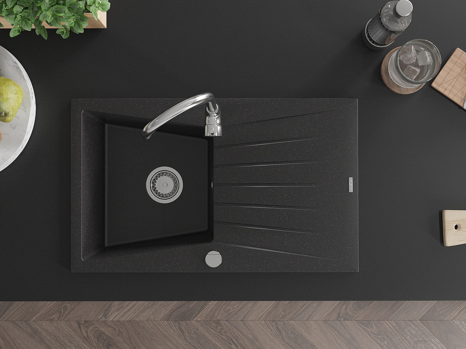 Mexen Cesar гранитна мивка с една камера и отцедник 775 x 470 мм, черен/сребрист металик, хромиран сифон - 6514771010-73