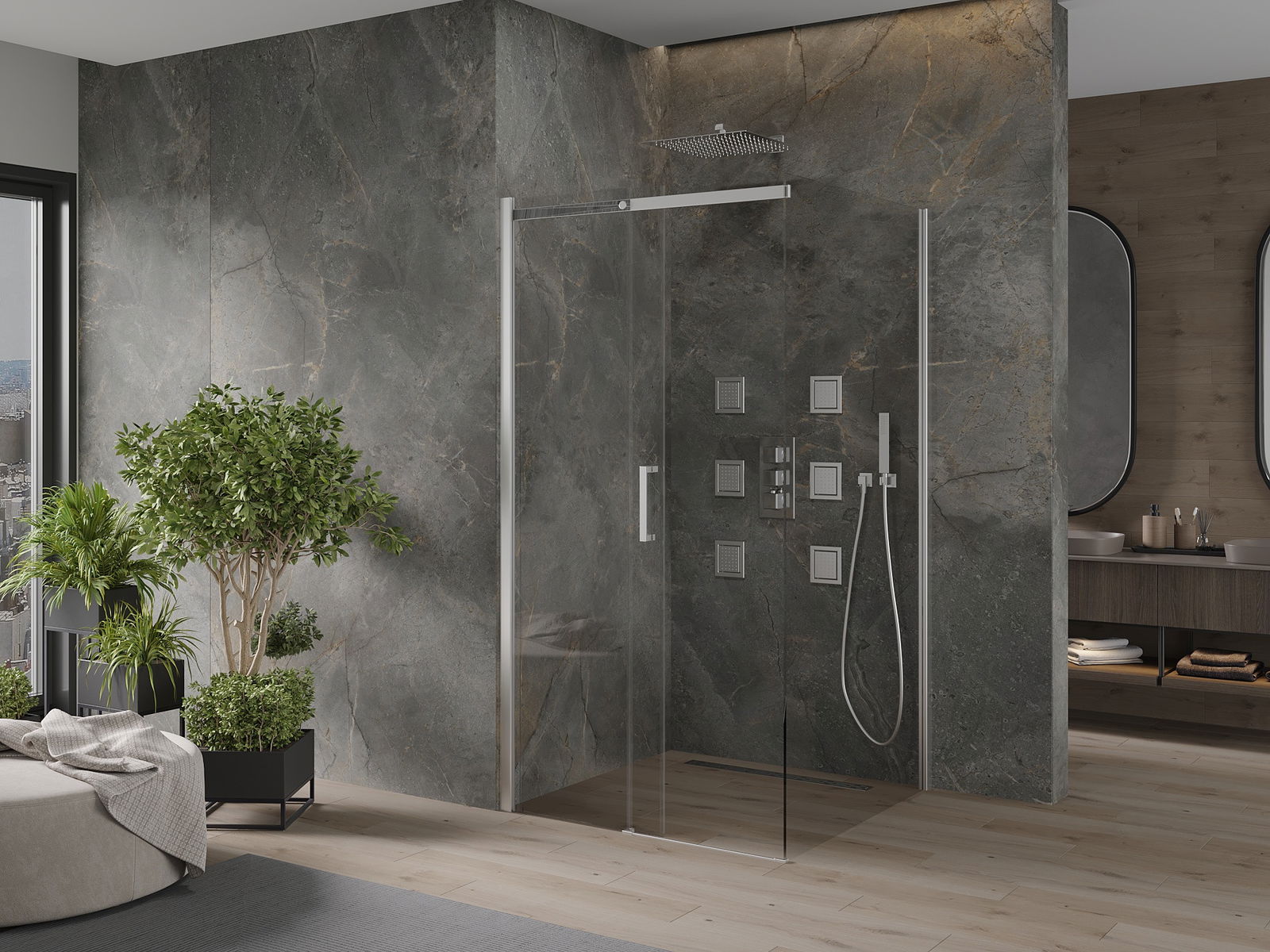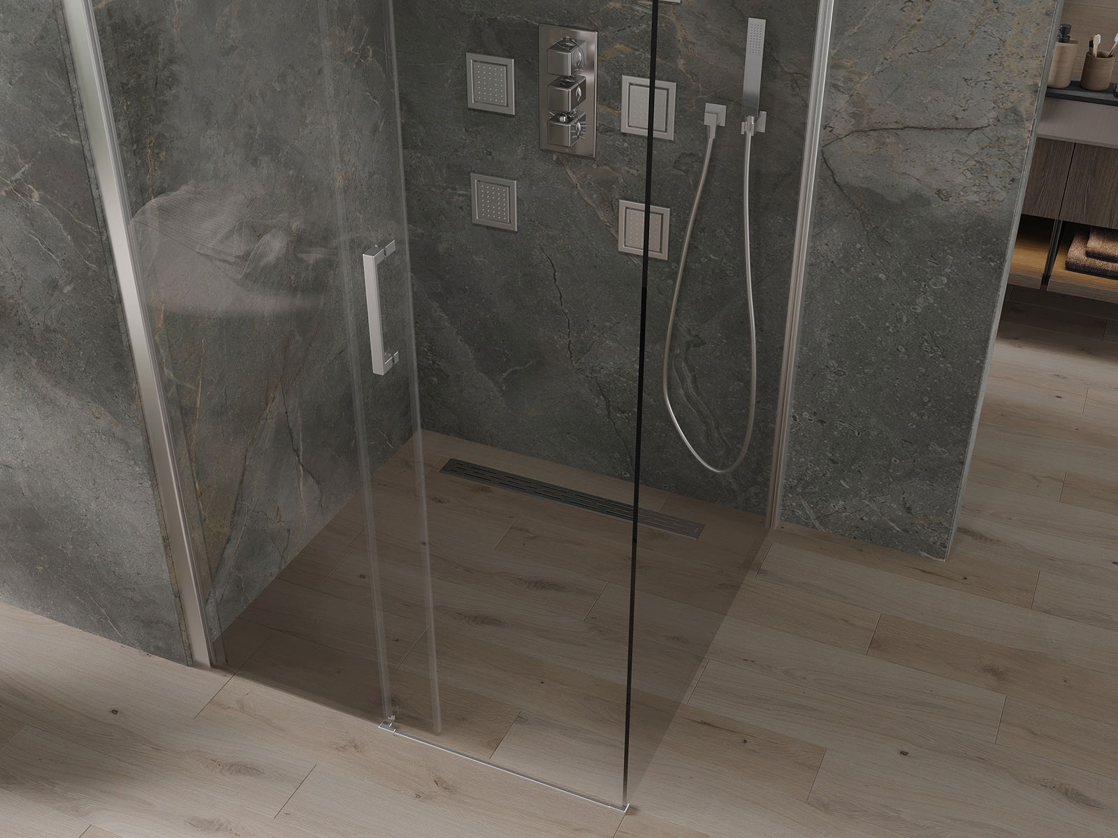 Плъзгащите се врати се движат около специални водачи и не изискват допълнително място, за да ги отворят, така че те ще работят в по -малки бани. Благодарение на двойните ролки с метално тяло, тяхното движение е течно.