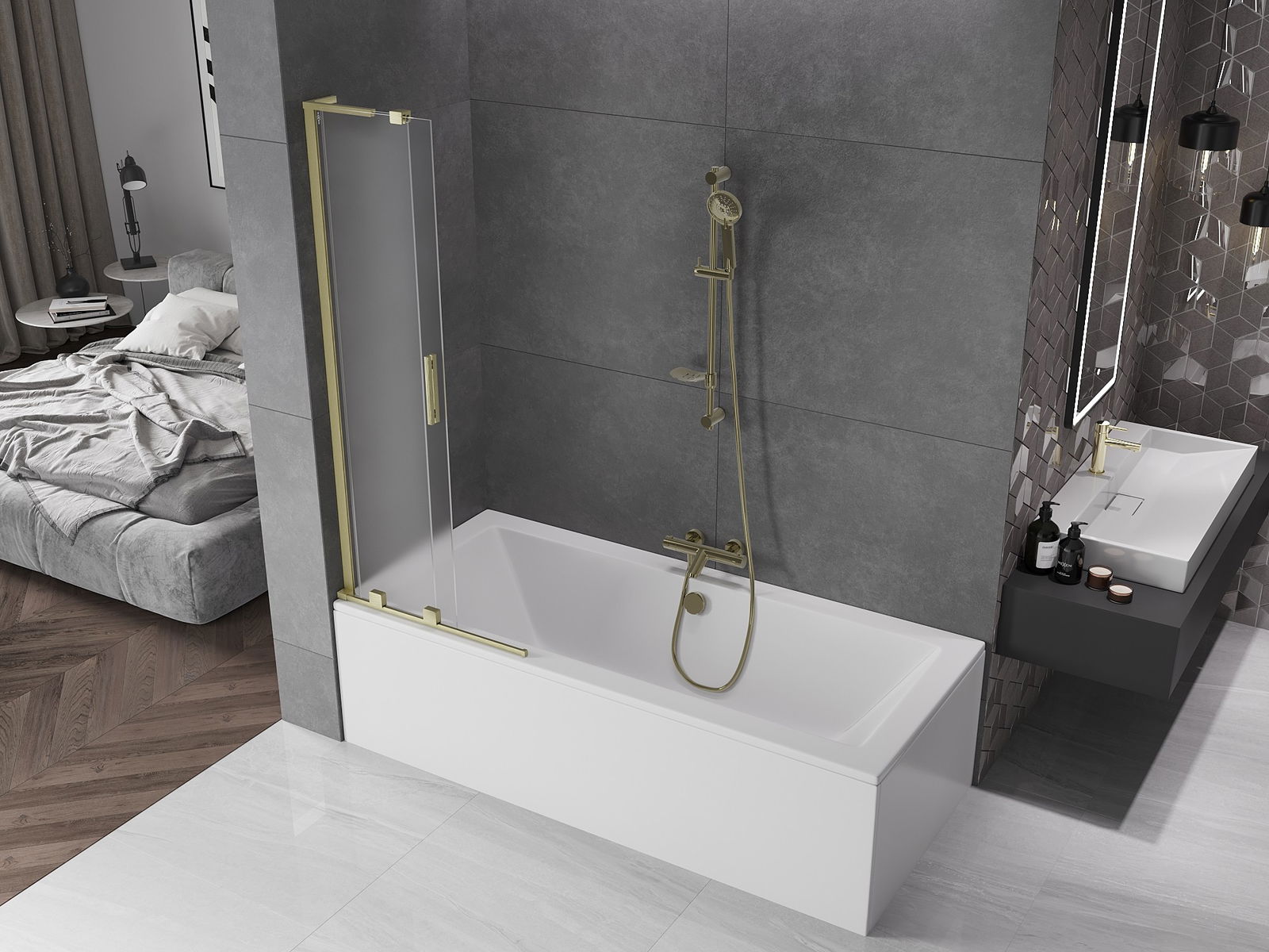 Mexen Velar L душ-екран на вана с 2 крила, плъзгащ се 75 x 150 см, матиран, златисто четкан - 896-075-003-31-55