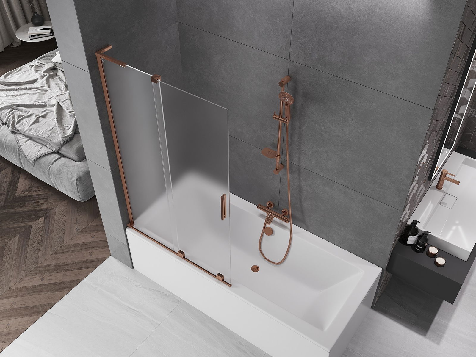 Mexen Velar L параван за вана с 2 подвижни крила, плъзгащ се 100 x 150 см, матиран, розово злато - 896-100-003-31-60