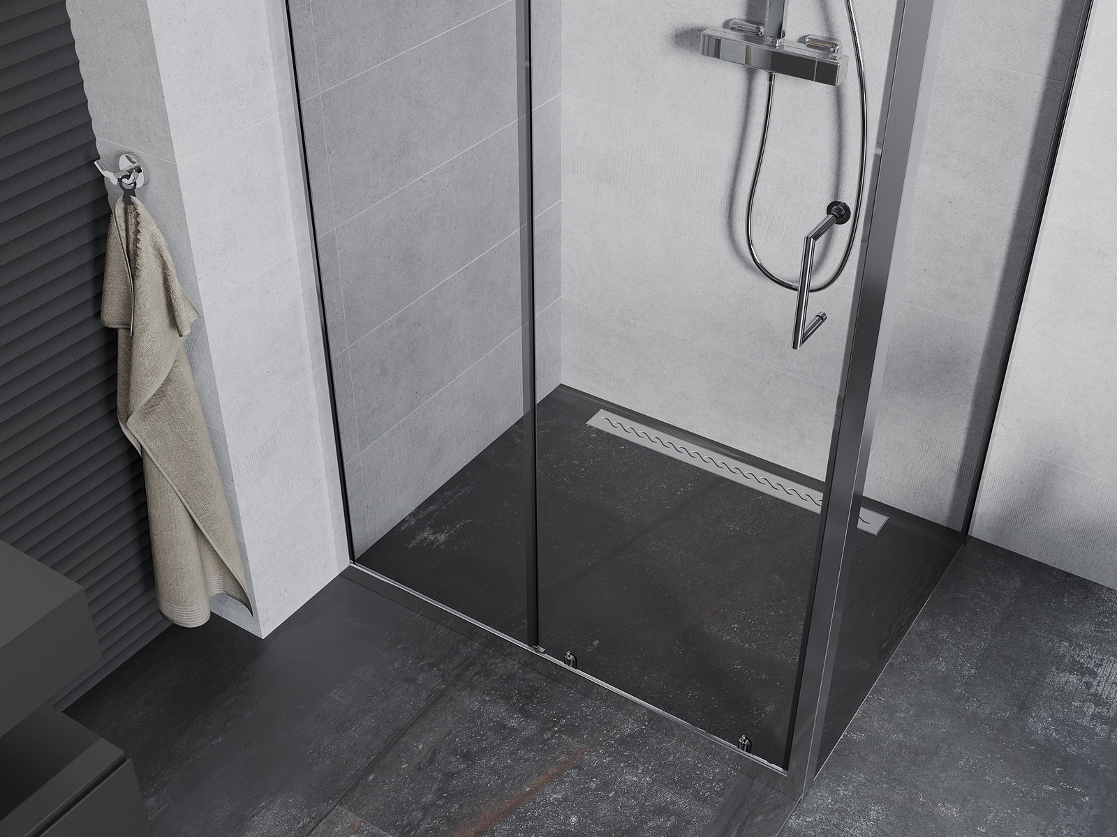 Удобната и практична дръжка е изработена от здрав и устойчив метал. Модерната форма в съчетание с покритието, съответстващо на цвета на профилите, придава на цялото модерен и стилен вид, подчертавайки естетиката на всяка баня.