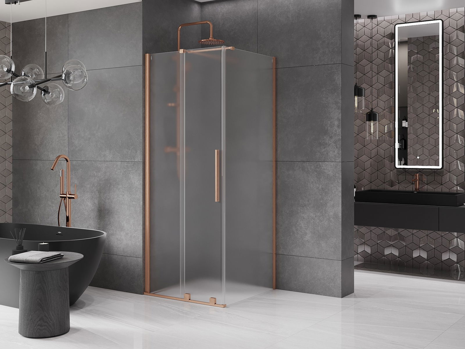 Практичната и удобна дръжка е изработена от неръждаема стомана. Модерната форма в комбинация с покритие, съчетано с цвета на профилите, придава на цялото съвременен и стилен вид, подчертавайки естетиката на всяка баня.