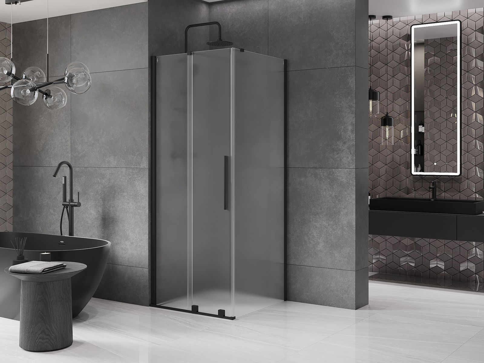 Практичната и удобна дръжка е изработена от неръждаема стомана. Модерната форма в комбинация с покритие, съчетано с цвета на профилите, придава на цялото съвременен и стилен вид, подчертавайки естетиката на всяка баня.