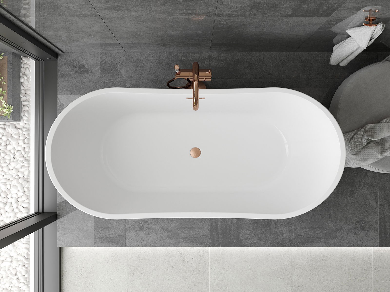 Mexen Montana е елегантна самостоятелно стояща вана с размери 150 x 75 см, изработена от санитарен акрил, който осигурява висока издръжливост и устойчивост на помътняване и UV радиация. Нейният модерен дизайн в бяло и черно и овалната форма добавят стил на всяка баня. Ваната е оборудвана с отвор за преливане и връзка за сифон, което улеснява монтажа. Допълнително, медното четкано покритие придава уникален характер, което я прави идеален избор за хора, които ценят естетиката и функционалността.