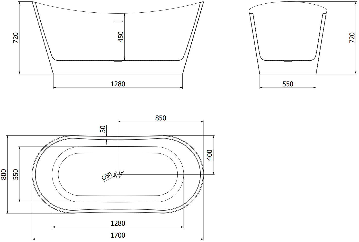 Mexen Montana свободностояща вана 170 x 80 cm, черна, черен преливник - 52011708070-70