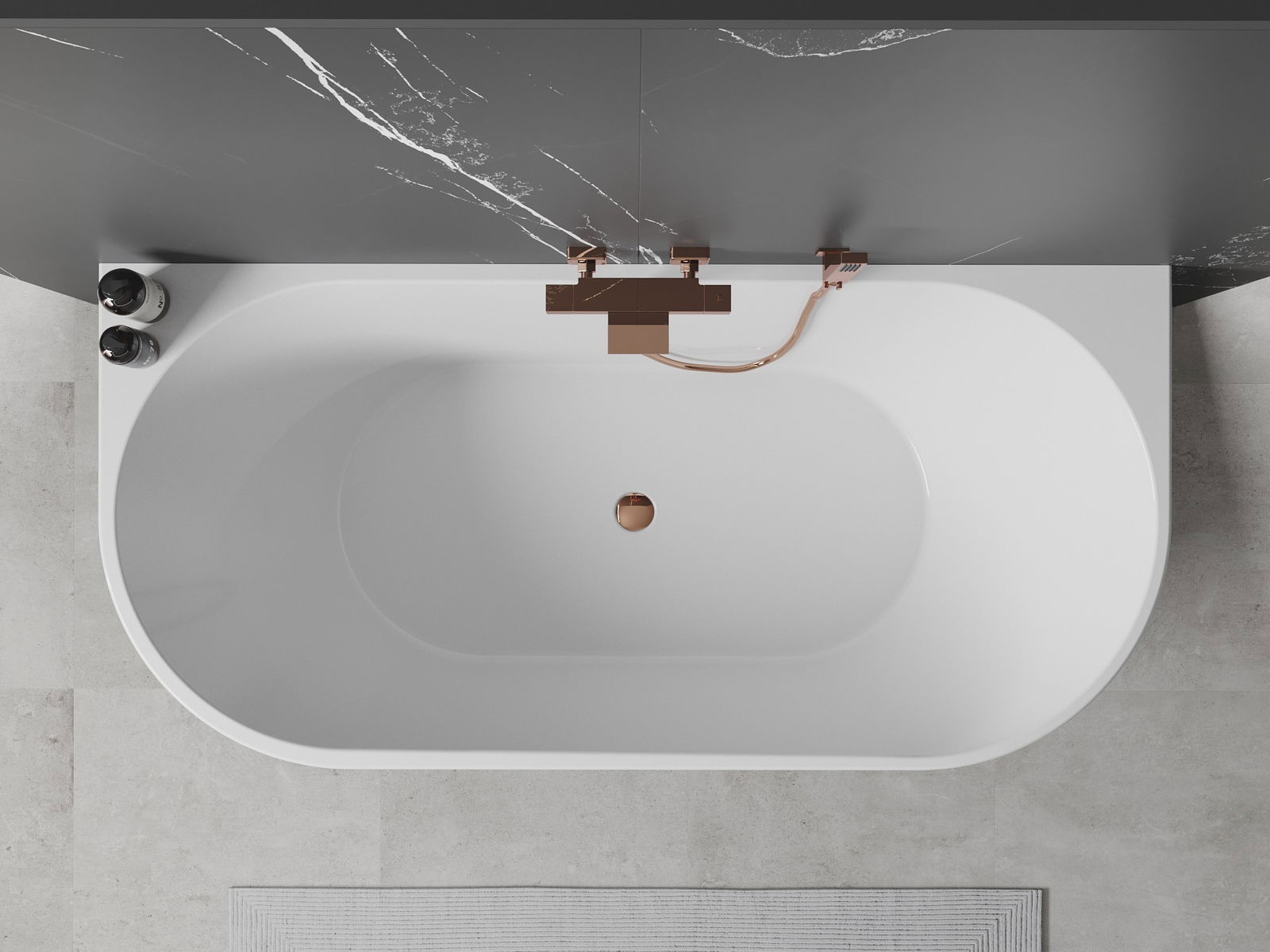 Овалната свободностояща вана в бял цвят е идеално решение за вашата баня. С размери 150 x 75 см, височина 58 см и дълбочина 45 см, тя предлага комфорт при къпане. Изработена от санитарен акрил, тя осигурява не само елегантен външен вид, но и устойчивост на UV лъчи и матовост. Завършекът в розово злато ѝ придава уникален характер. Ваната има отвор за преливник и лесна инсталация до стената, което я прави практичен избор за всяко домакинство.
