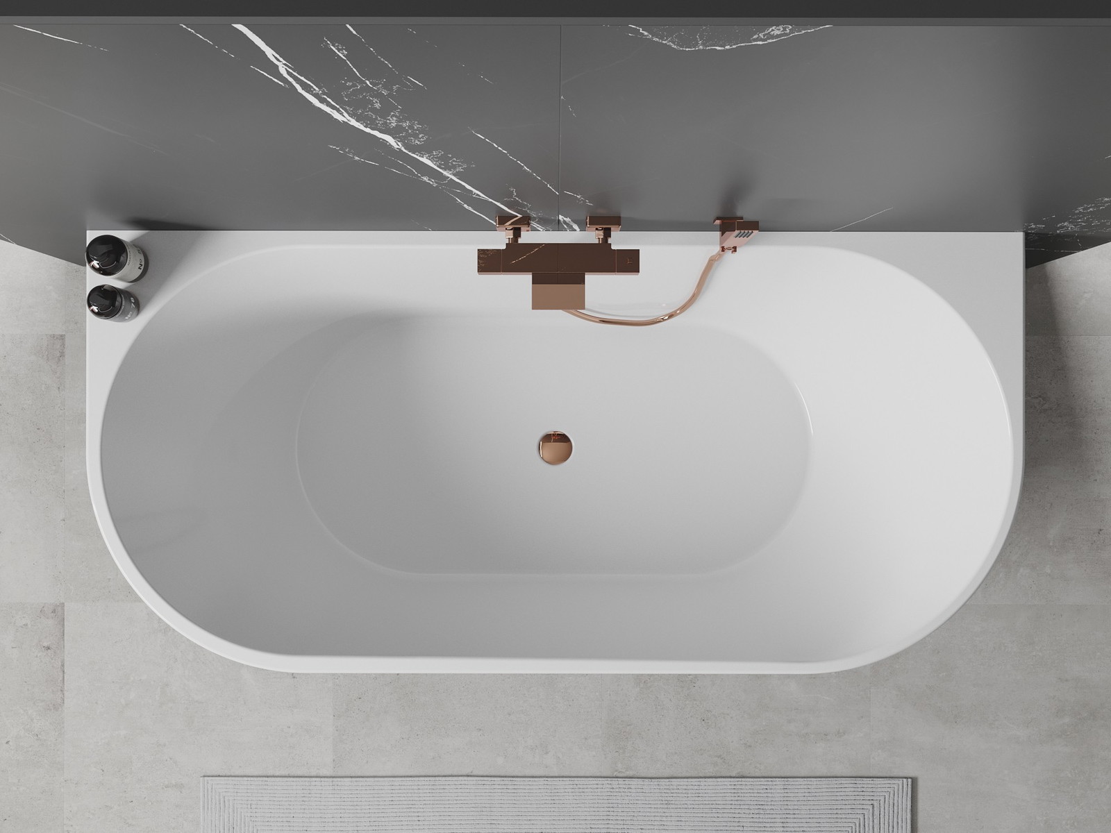 Mexen Oval самостоятелна вана до стена с размери 160 x 80 см е идеалната комбинация от елегантност и функционалност. Изработена от санитарен акрил, осигурява изключителна устойчивост на заматяване и UV радиация. Гладката, бяла повърхност в съчетание с розово-златен завършек гарантира модерен вид. Ваната има дълбочина 45 см и височина 58 см, което допринася за удобство при ползване. Допълнително, в комплекта има сифон и капак клик-клак, което я прави много практичен избор.