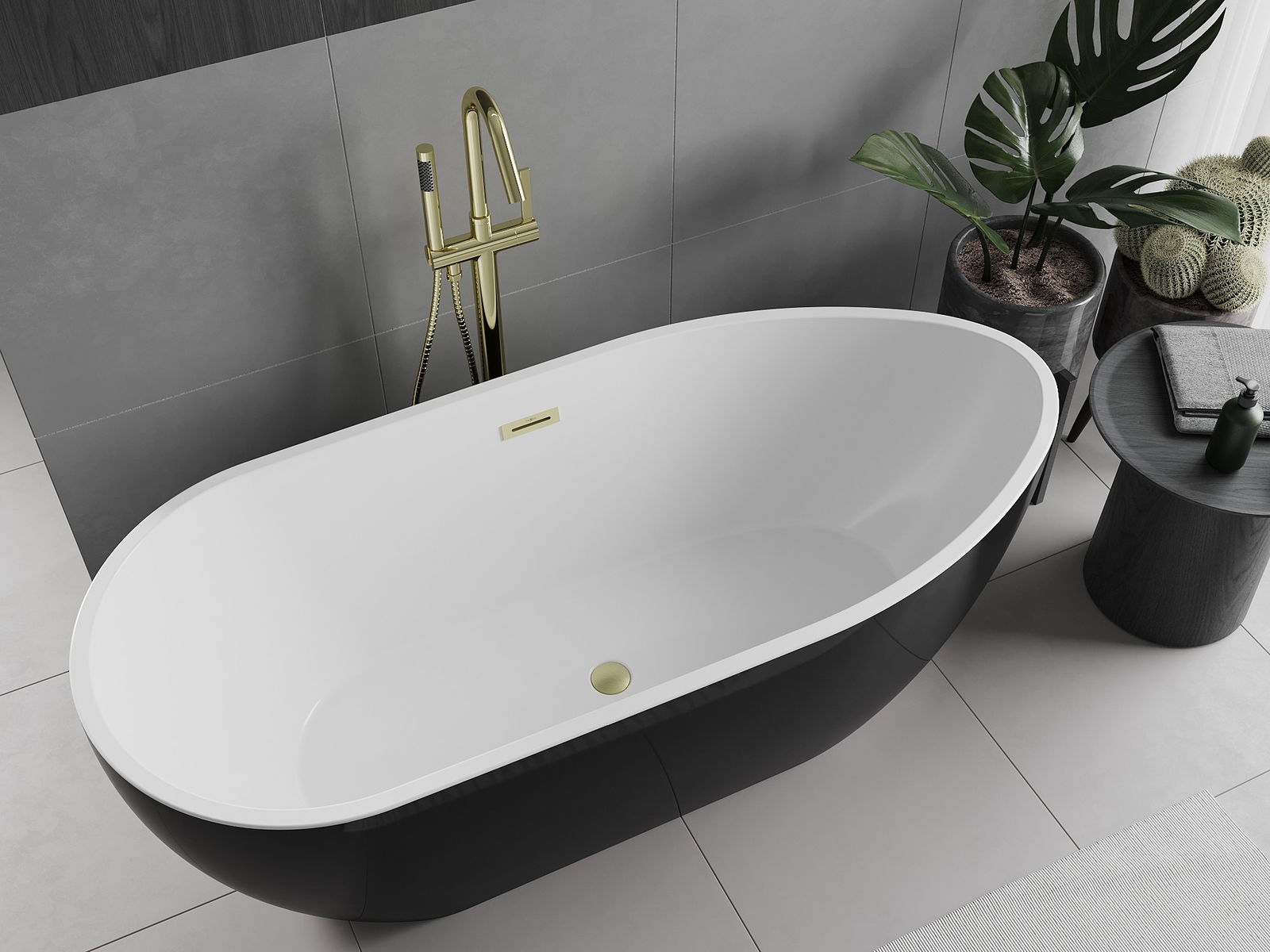 Предлагаме самостоятелна вана с размери 170 x 75 см, в елегантна комбинация от цветове бял и черен, със златен четкан завършек. Нейната овална форма и високото качество на санитарния акрил осигуряват комфорт и естетика на най-високо ниво. Ваната е самостоятелна, лесна за монтаж и има отлив, разположен в средата. Допълнително, е проектирана да бъде устойчива на замъгляване и UV лъчение, което гарантира дълготрайна употреба без загуба на качество.