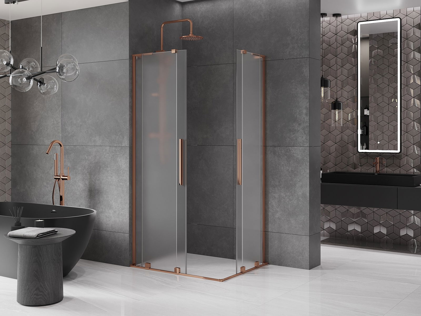 Практичната и удобна дръжка е изработена от неръждаема стомана. Модерната форма в комбинация с покритие, съчетано с цвета на профилите, придава на цялото съвременен и стилен вид, подчертавайки естетиката на всяка баня.