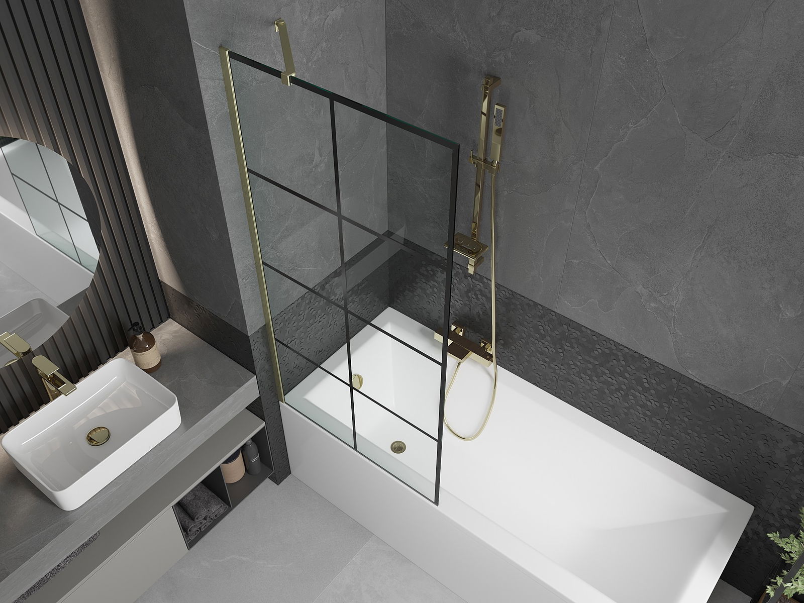 Mexen Next параван за вана 1-крилен 80 x 150 cm, черна решетка, златен четкан - 895-080-000-00-77-55
