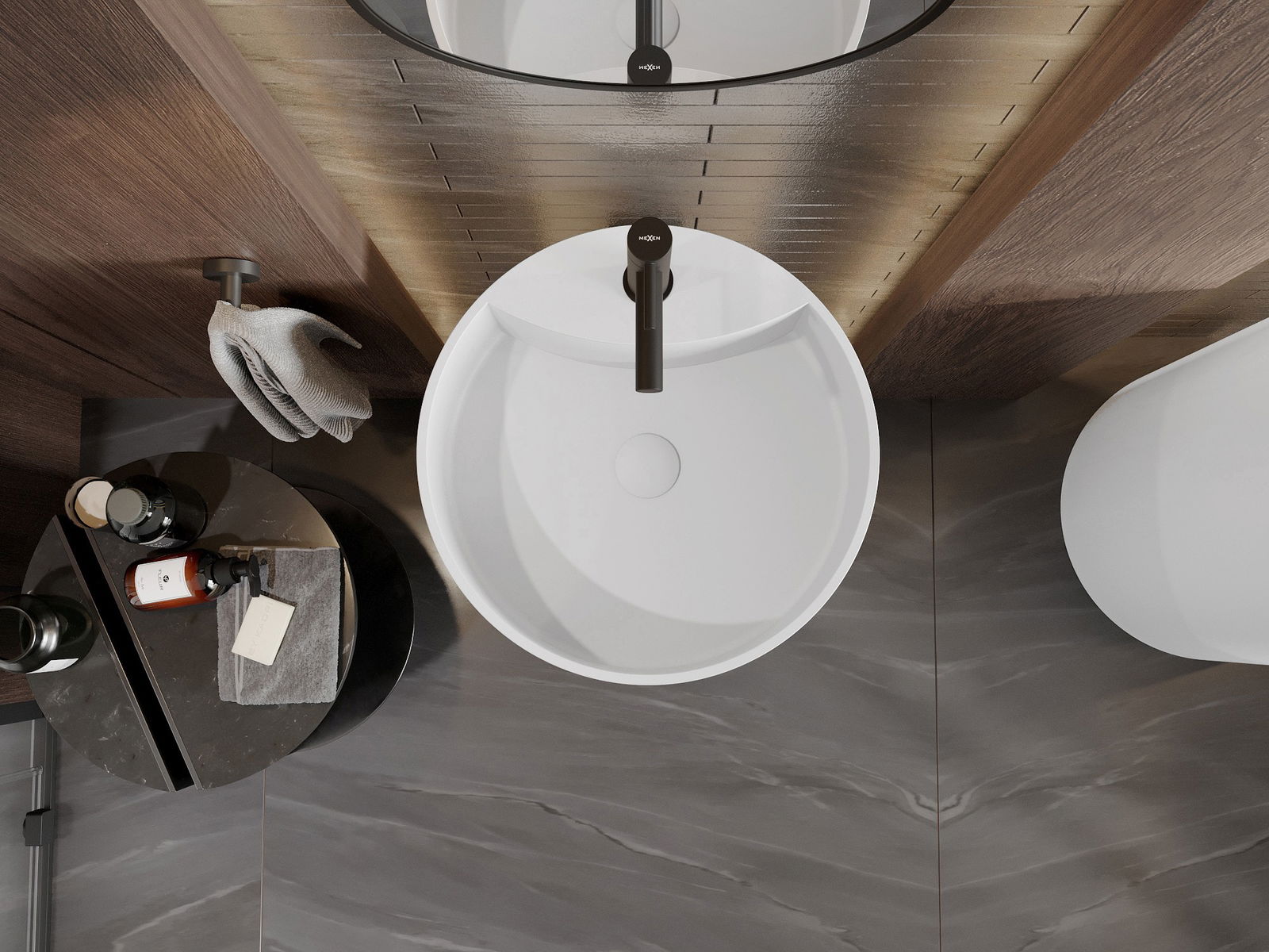 Умивалникът има отвор, в който можем да монтираме батерия. Това позволява да се спести ценно пространство в банята и да подчертае нейната естетика. Това решение също така улеснява поддържането на чистота около умивалника.