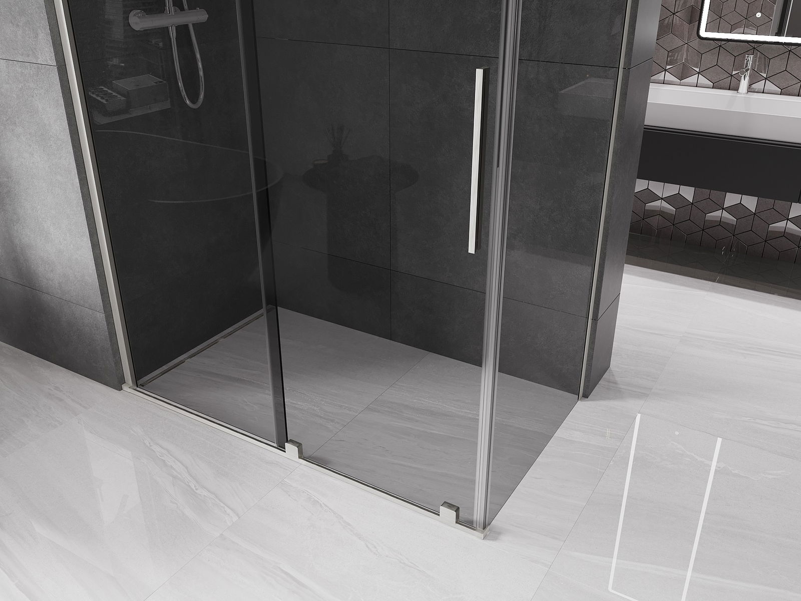 Практичната и удобна дръжка е изработена от неръждаема стомана. Модерната форма в комбинация с покритие, съчетано с цвета на профилите, придава на цялото съвременен и стилен вид, подчертавайки естетиката на всяка баня.