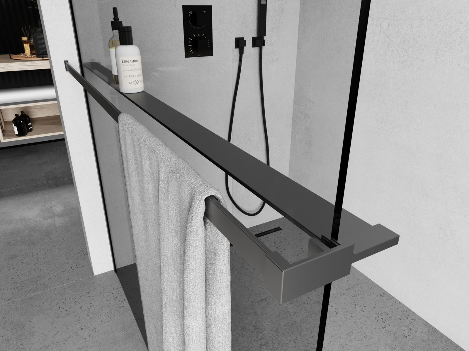 Mexen рафт за душ преграда с релс за кърпи, gun metal - 800-02-95
