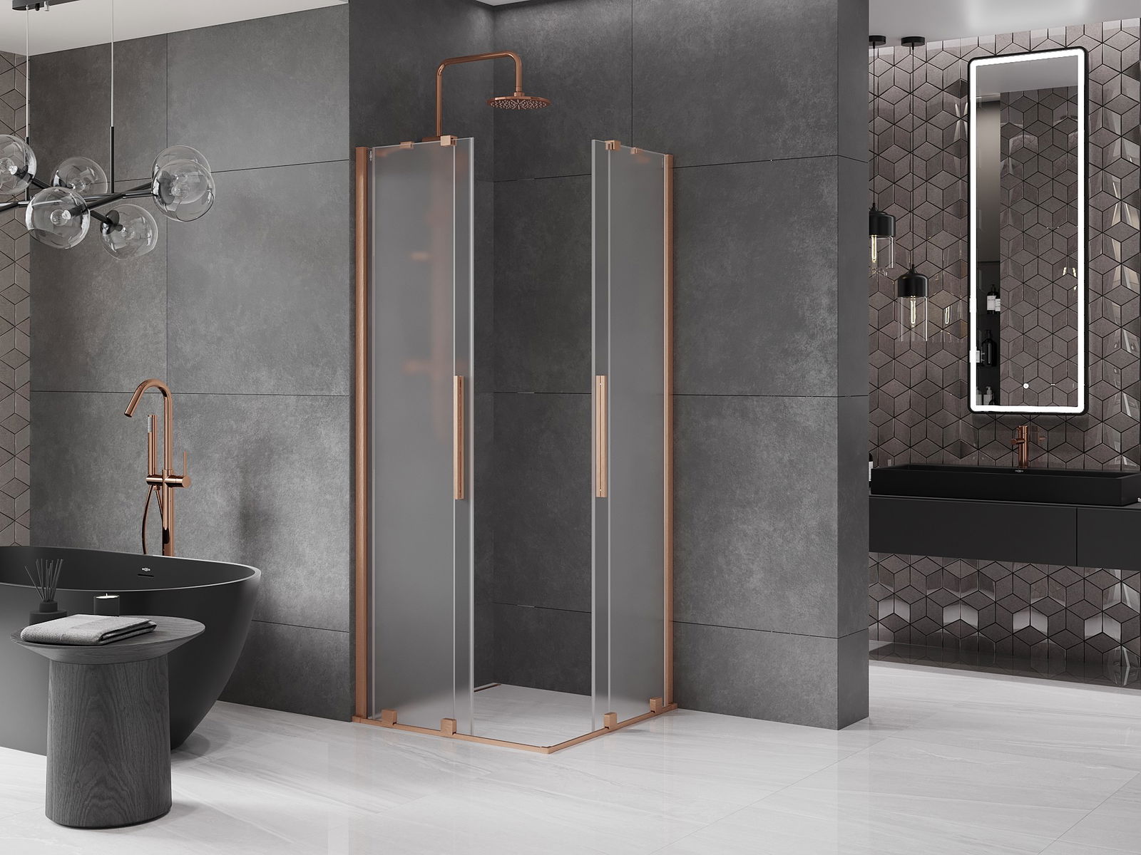 Практичната и удобна дръжка е изработена от неръждаема стомана. Модерната форма в комбинация с покритие, съчетано с цвета на профилите, придава на цялото съвременен и стилен вид, подчертавайки естетиката на всяка баня.