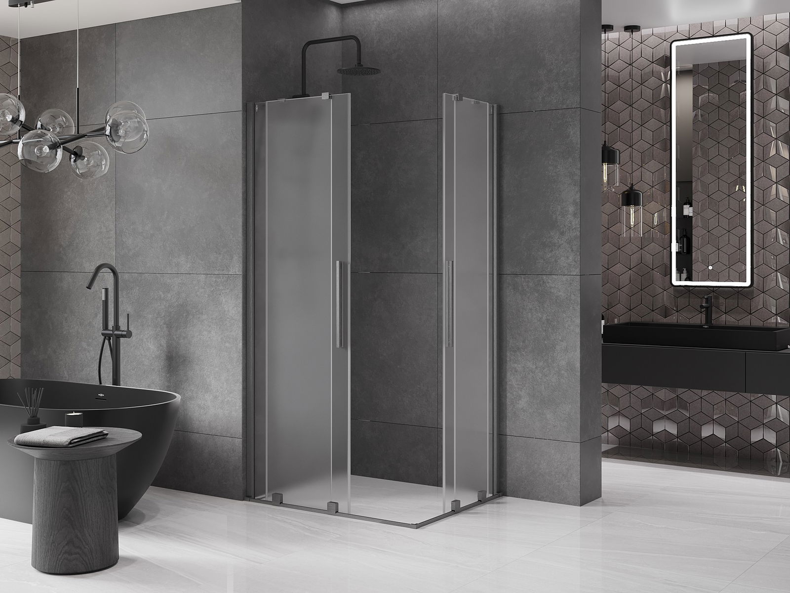 Практичната и удобна дръжка е изработена от неръждаема стомана. Модерната форма в комбинация с покритие, съчетано с цвета на профилите, придава на цялото съвременен и стилен вид, подчертавайки естетиката на всяка баня.