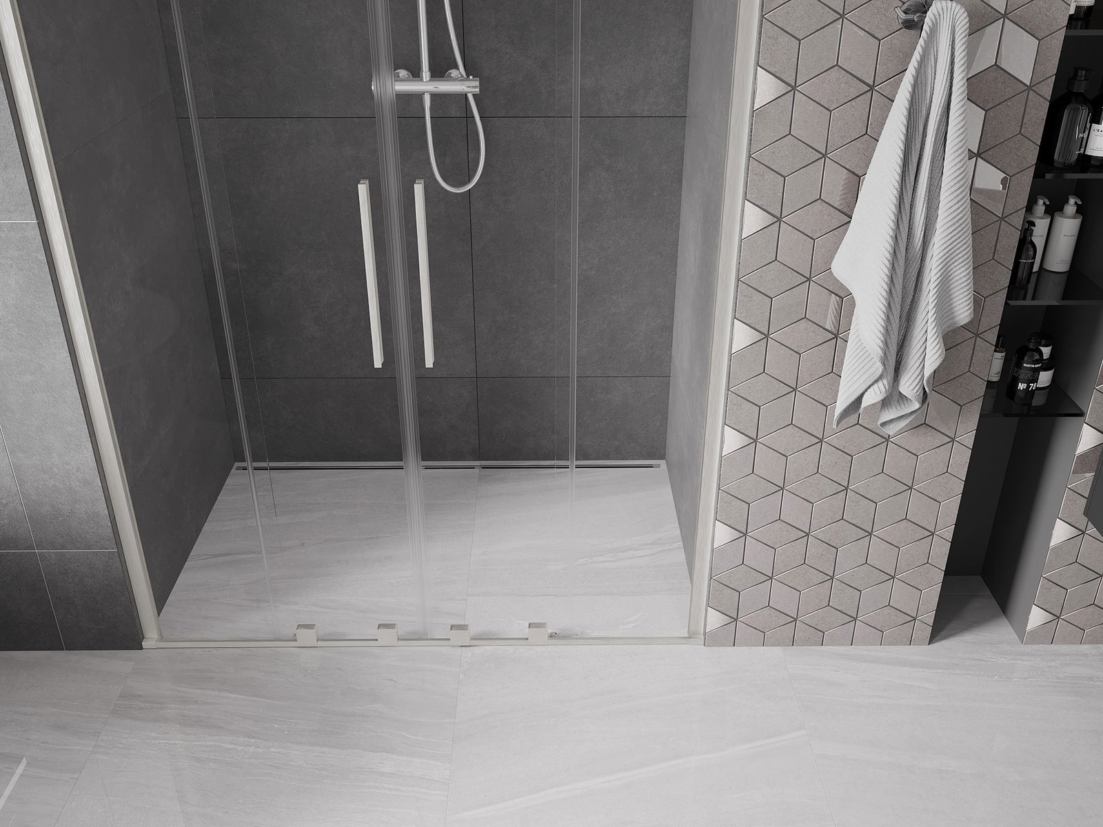 Практичната и удобна дръжка е изработена от неръждаема стомана. Модерната форма в комбинация с покритие, съчетано с цвета на профилите, придава на цялото съвременен и стилен вид, подчертавайки естетиката на всяка баня.