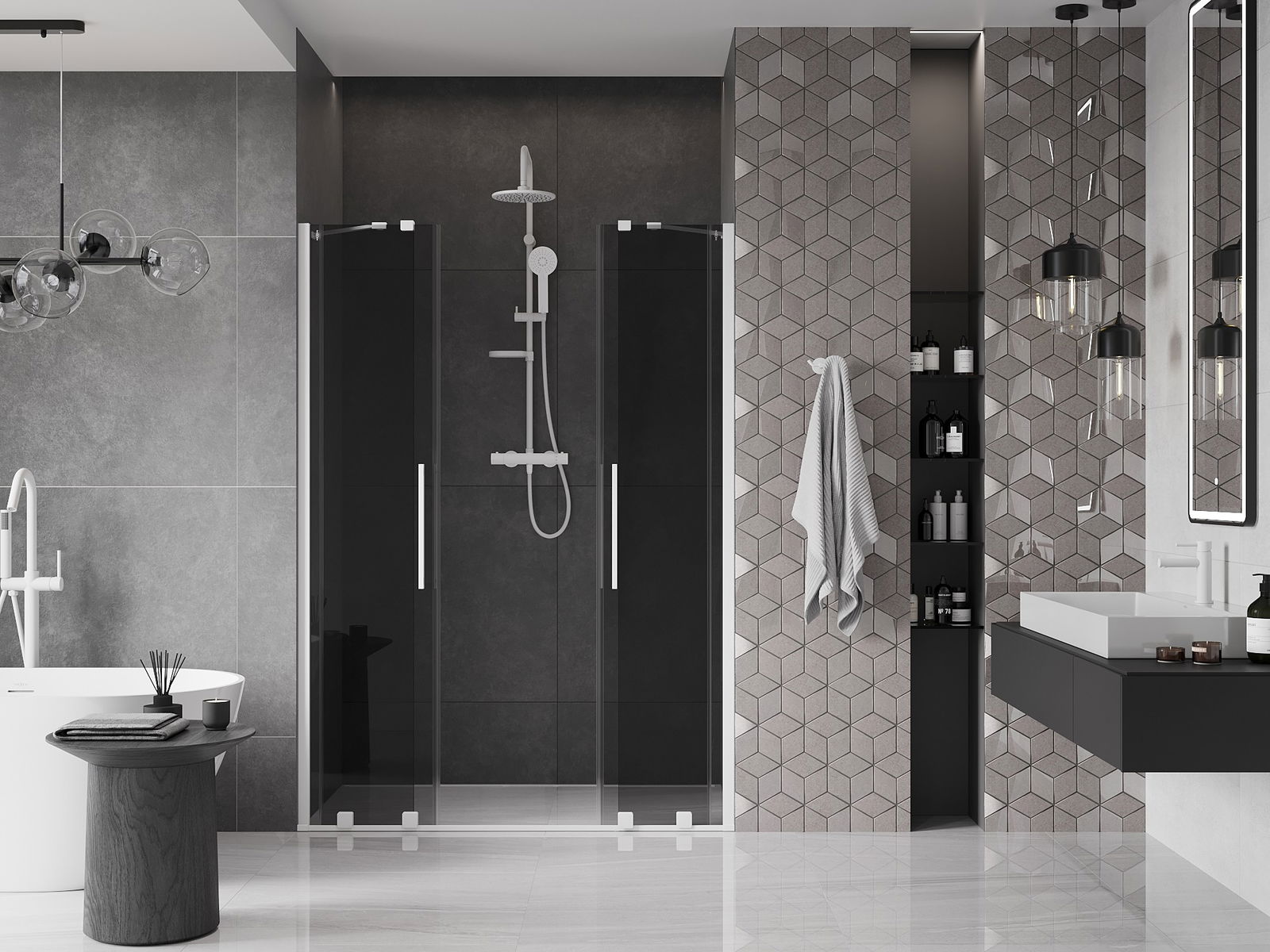 Практичната и удобна дръжка е изработена от неръждаема стомана. Модерната форма в комбинация с покритие, съчетано с цвета на профилите, придава на цялото съвременен и стилен вид, подчертавайки естетиката на всяка баня.