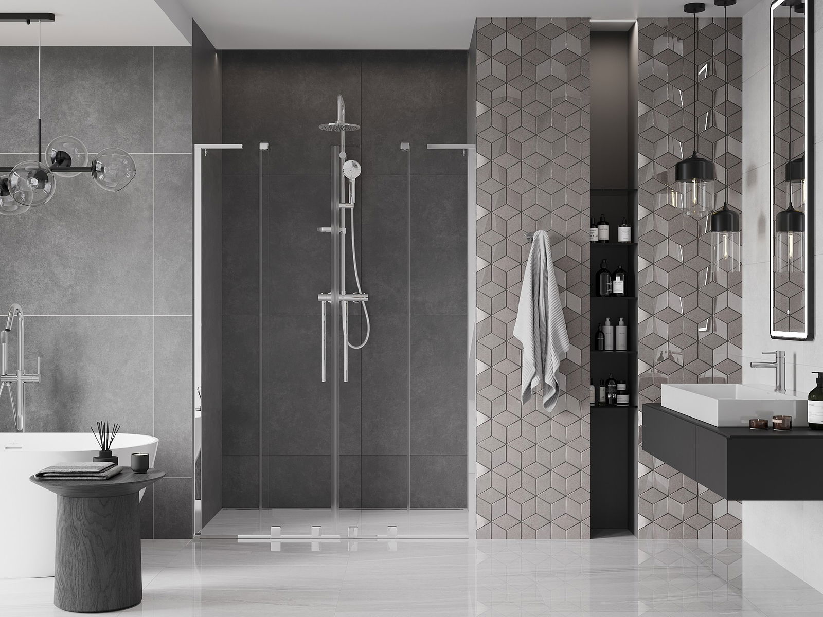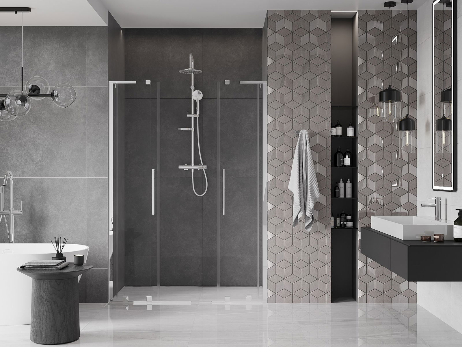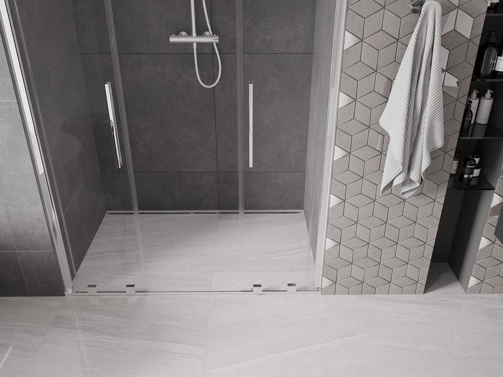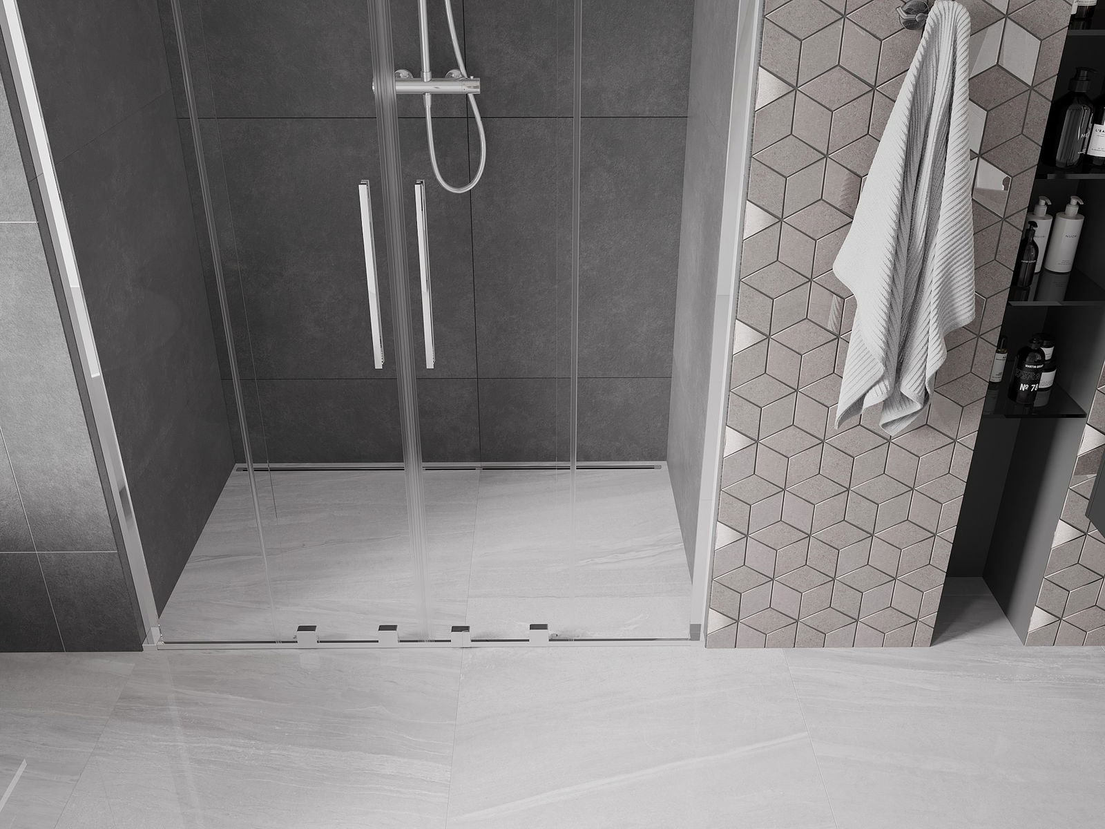 Практичната и удобна дръжка е изработена от неръждаема стомана. Модерната форма в комбинация с покритие, съчетано с цвета на профилите, придава на цялото съвременен и стилен вид, подчертавайки естетиката на всяка баня.