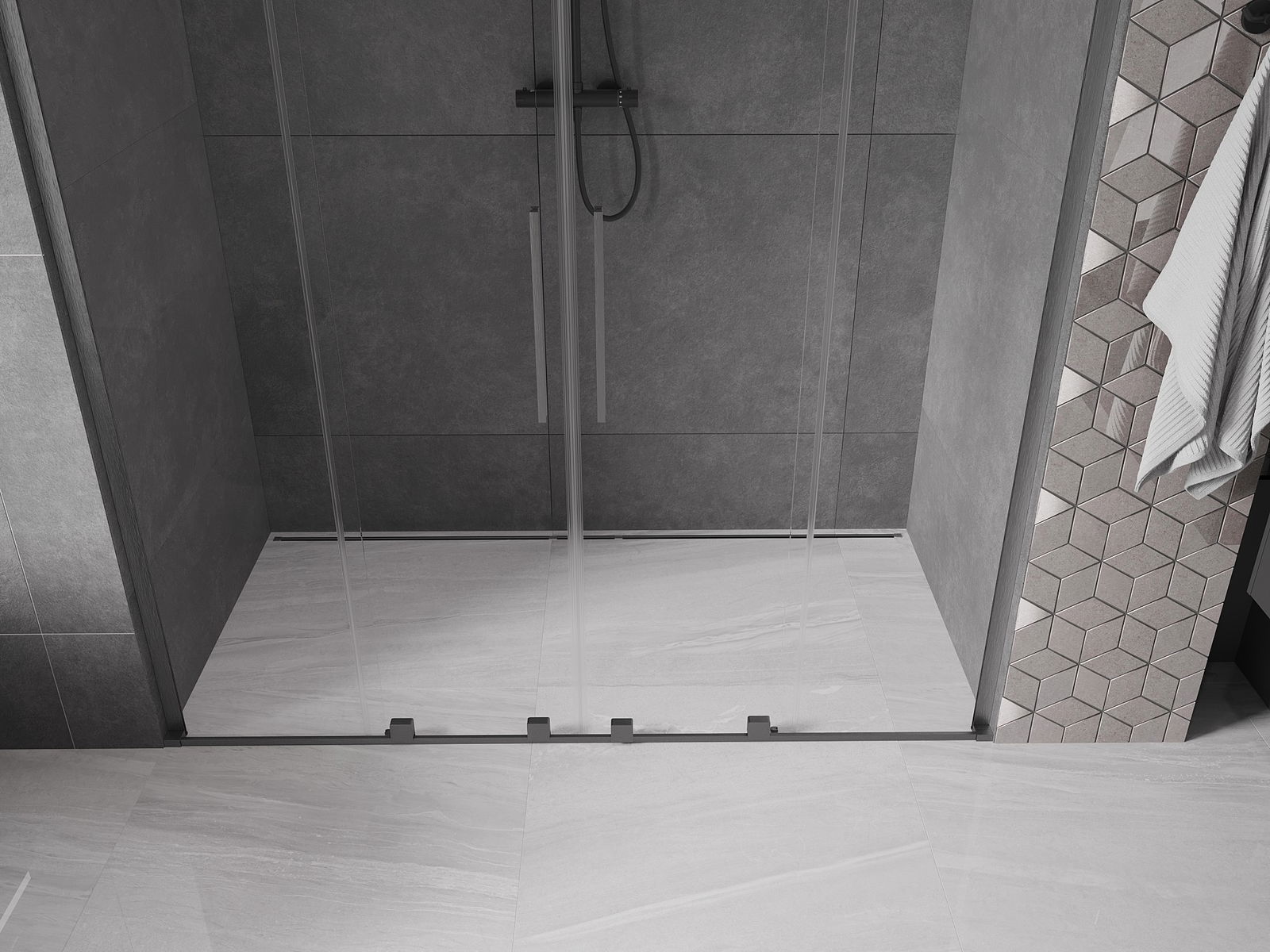 Практичната и удобна дръжка е изработена от неръждаема стомана. Модерната форма в комбинация с покритие, съчетано с цвета на профилите, придава на цялото съвременен и стилен вид, подчертавайки естетиката на всяка баня.