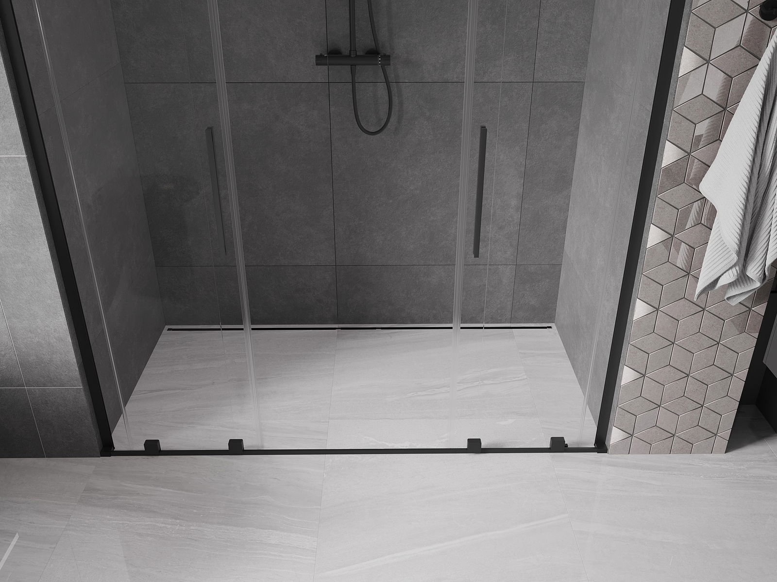 Практичната и удобна дръжка е изработена от неръждаема стомана. Модерната форма в комбинация с покритие, съчетано с цвета на профилите, придава на цялото съвременен и стилен вид, подчертавайки естетиката на всяка баня.