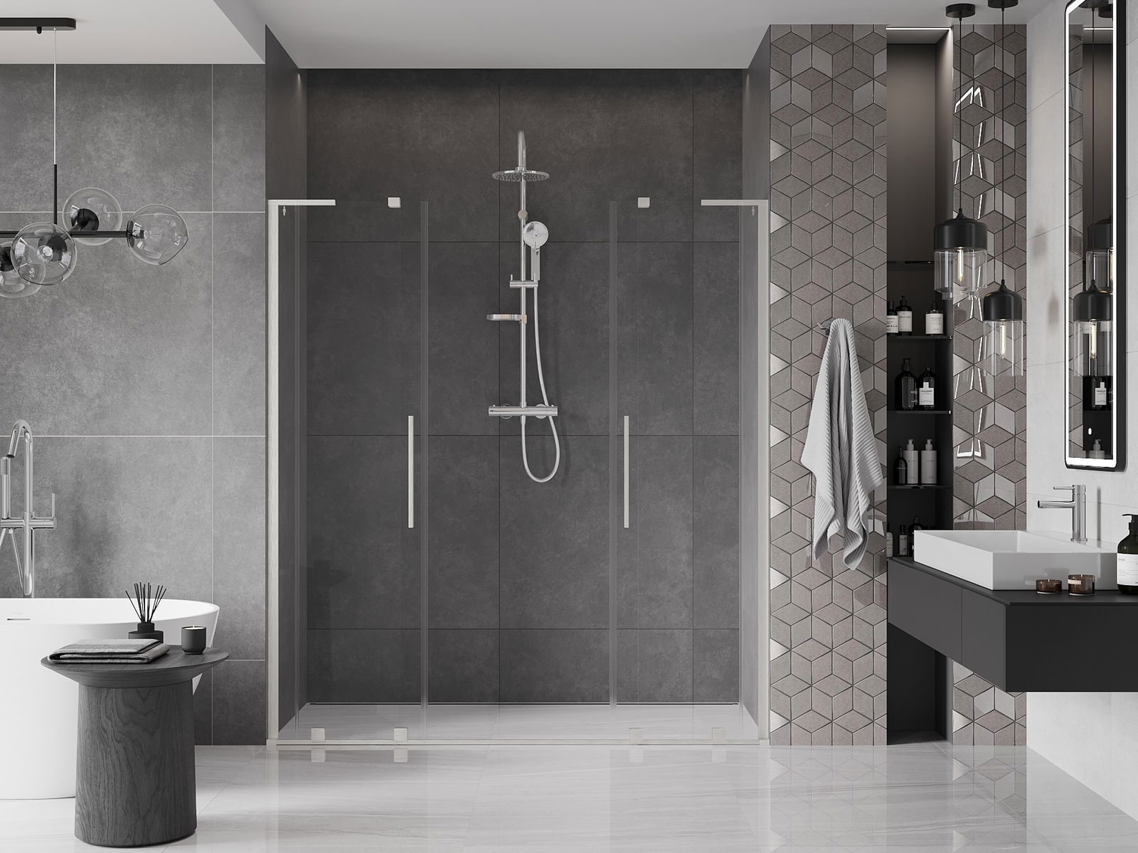 Практичната и удобна дръжка е изработена от неръждаема стомана. Модерната форма в комбинация с покритие, съчетано с цвета на профилите, придава на цялото съвременен и стилен вид, подчертавайки естетиката на всяка баня.